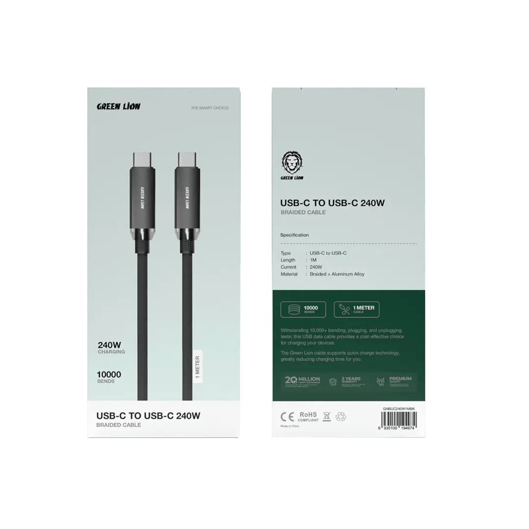 The Green Lion Braided Type-C to Type-C Cable 240W 1M – Black is for fast, efficient, and reliable performance. This product is equipped with a power delivery of 240W and a data transfer rate of 480 Mbps. This cable can offer rapid charging and fluent transmission among all Type-C devices within 1 meter. The durable braid with aluminum alloy connectors provides long-term usage and tangle-free convenience. It is widely compatible and thus perfect for smartphones, tablets, laptops, and more. Safe and secure, this cable provides high performance with consistent connectivity while protecting your device. Compact and versatile, it is the perfect home, office, or travel accessory.