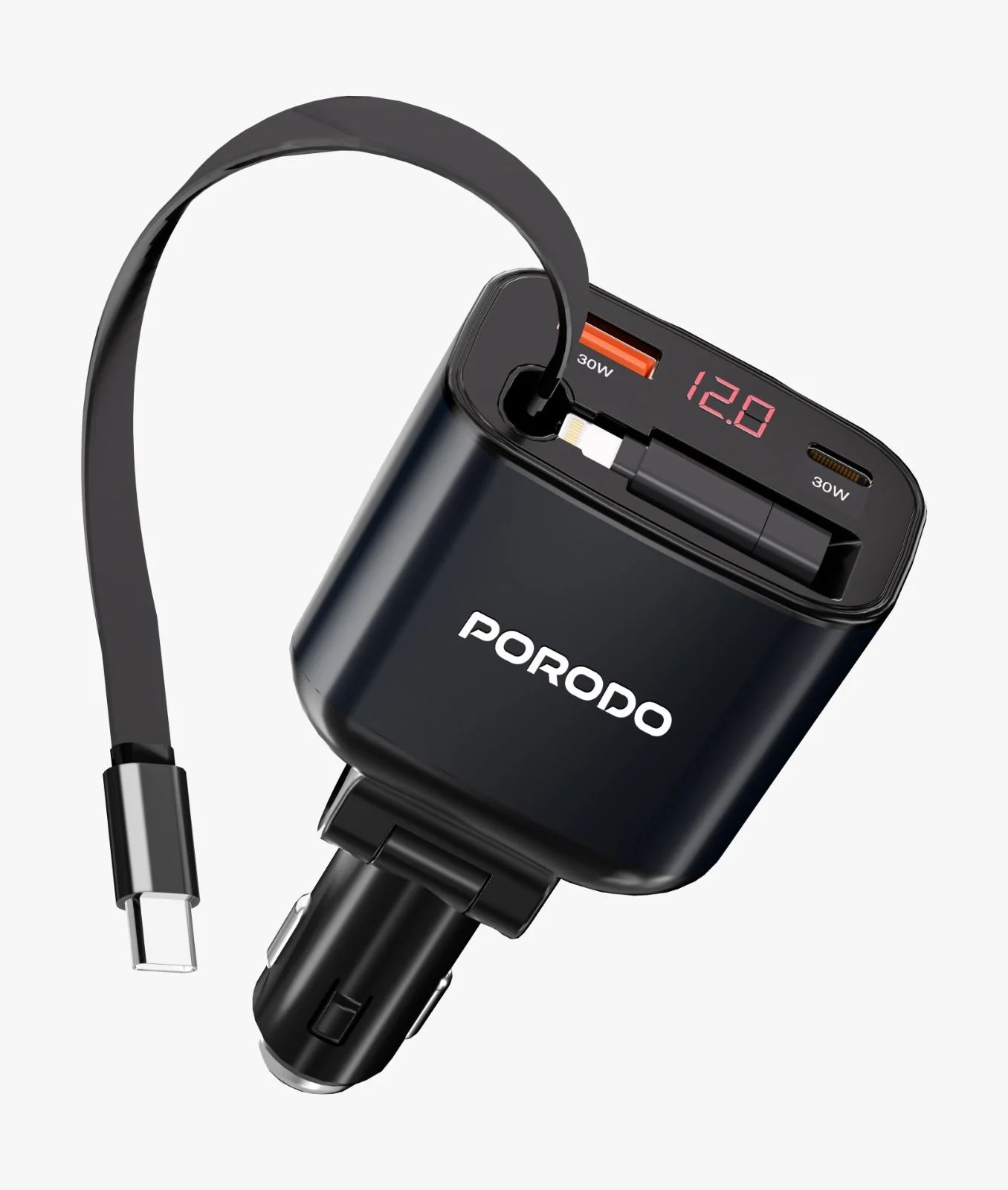 Porodo 105W Car Charger With Retractable Cable and Digital Display – Black
