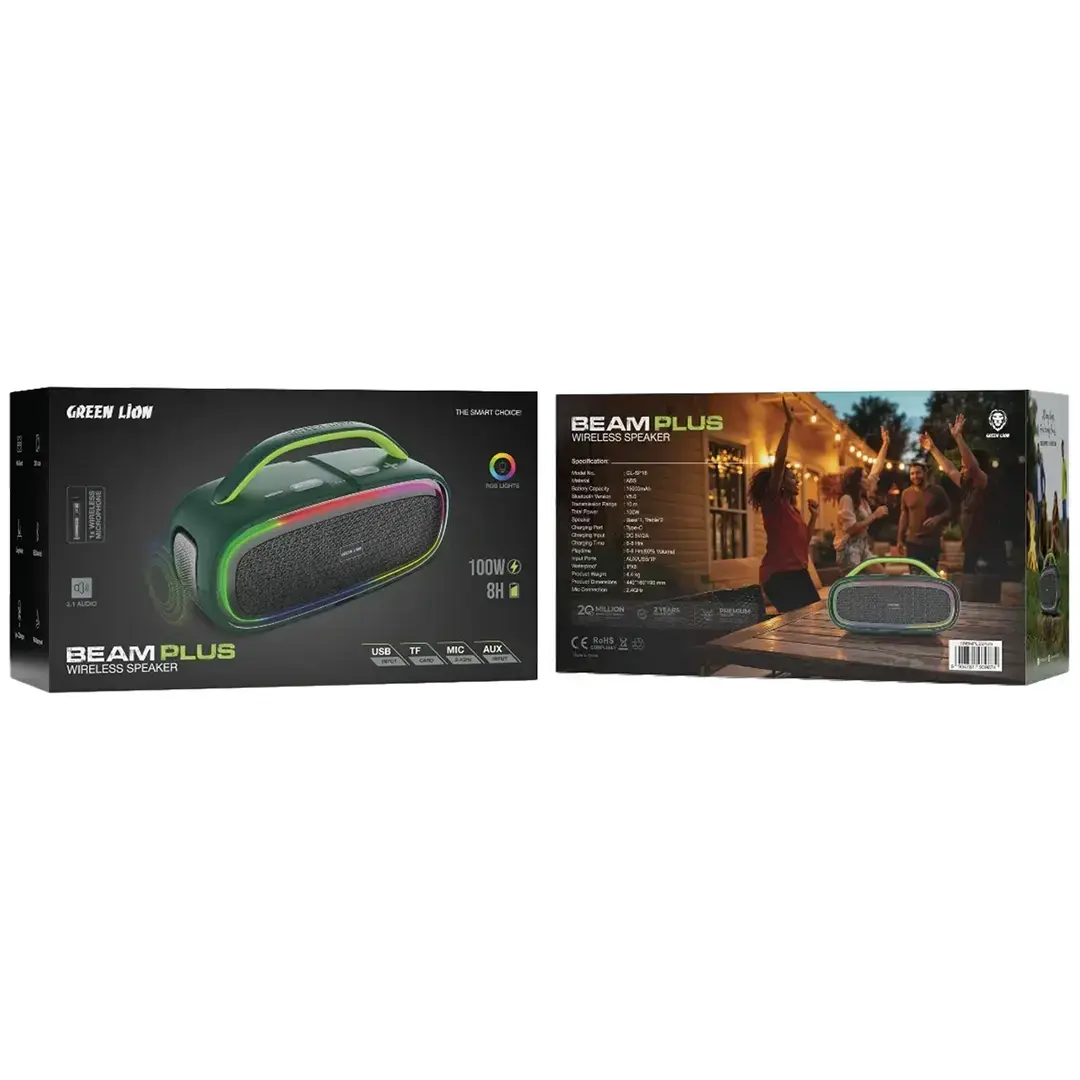 The Green Lion Beam Plus Wireless Speaker marries power with portability for the perfect sound experience. Made of ABS material, the speaker has a 15,000mAh battery that offers 6-8 hours of playtime at 60% volume. Bluetooth V5.0 ensures a steady connection while the range provides for 10 meters. The 100W total power allows clear highs and throbbing bass with a layout of 1 bass and 2 treble speakers for an expansive experience of HiFi sound. On the IPX6 waterproof protection scale, it sits well for outdoor use and is guarded against splashes and rain. Input is carried via AUX, USB, and TF card, with a 2.4GHz mic connection. Charging is done swiftly via Type-C, and there is a carry handle attached for a put-on-the-go. The 360° audio assures rich sound in all directions that caters to any setting.