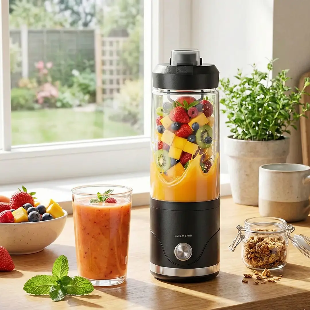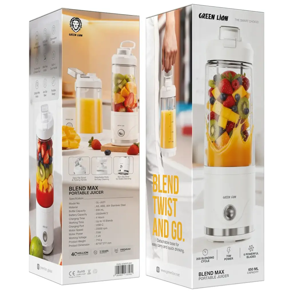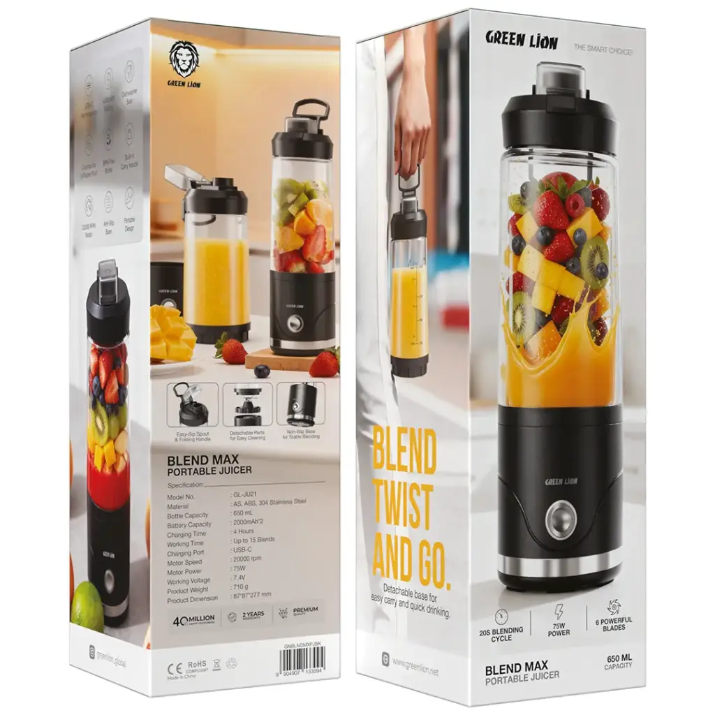 The Green Lion Blend Max Portable Juicer offers users a powerful and convenient solution to create their blended beverages while they travel. The system uses 20000 RPM motor technology to create an efficient ice and frozen fruit crushing mechanism, which produces smoothies and juices. The portable design of the product enables users to blend their drinks anywhere they go, while making drinks at home. The 650mL BPA-free bottle provides secure and healthy drink options throughout any usage situation. The 4000mAh battery enables users to blend their drinks 15 times after a single charge, which they can complete through the USB-C rechargeable system. The anti-slip base maintains blending stability while users can easily operate and clean the device through its detachable base system. The Green Lion Blend Max Portable Juicer provides users with a dependable device that supports their quest for a nutritious existence through smoothie and juice production.