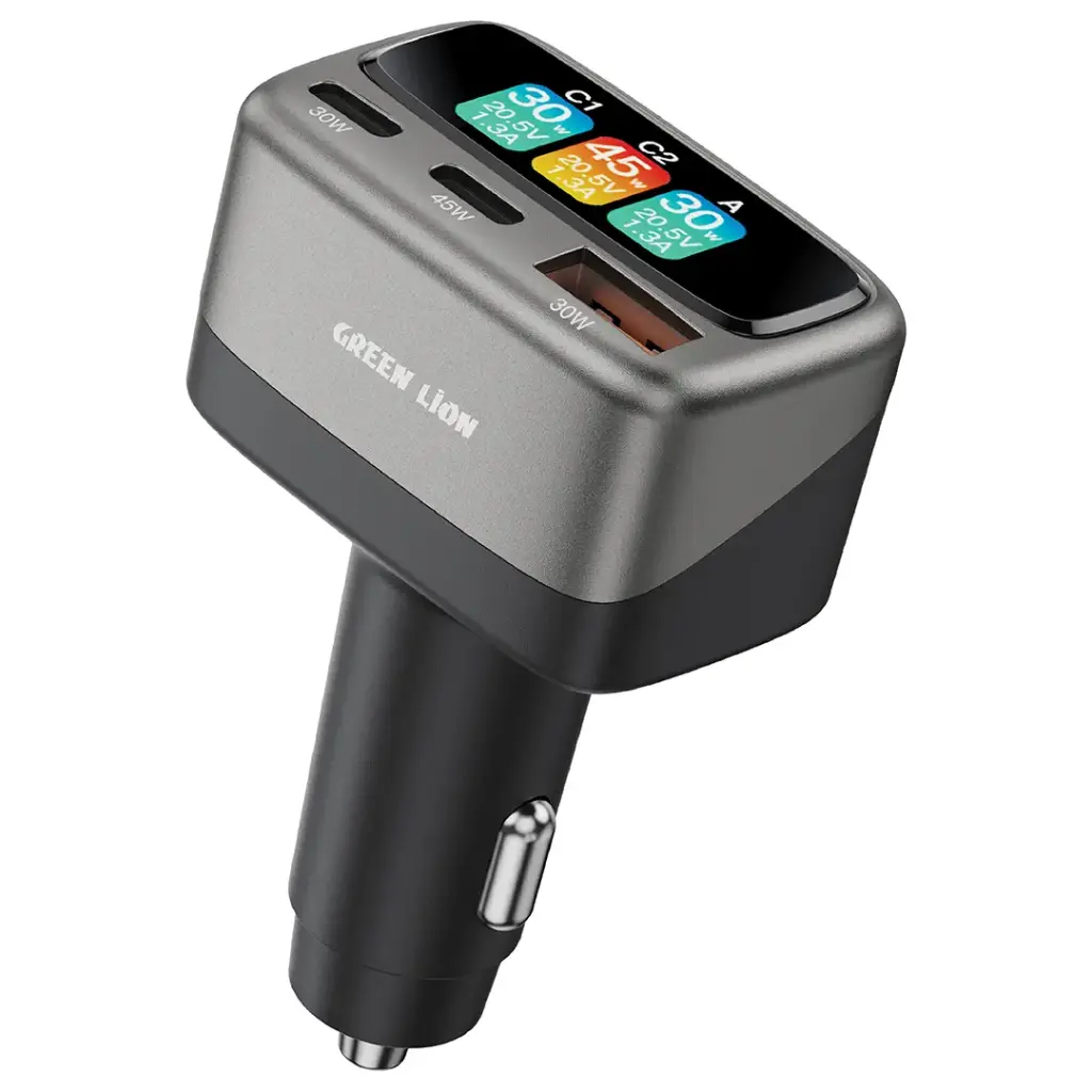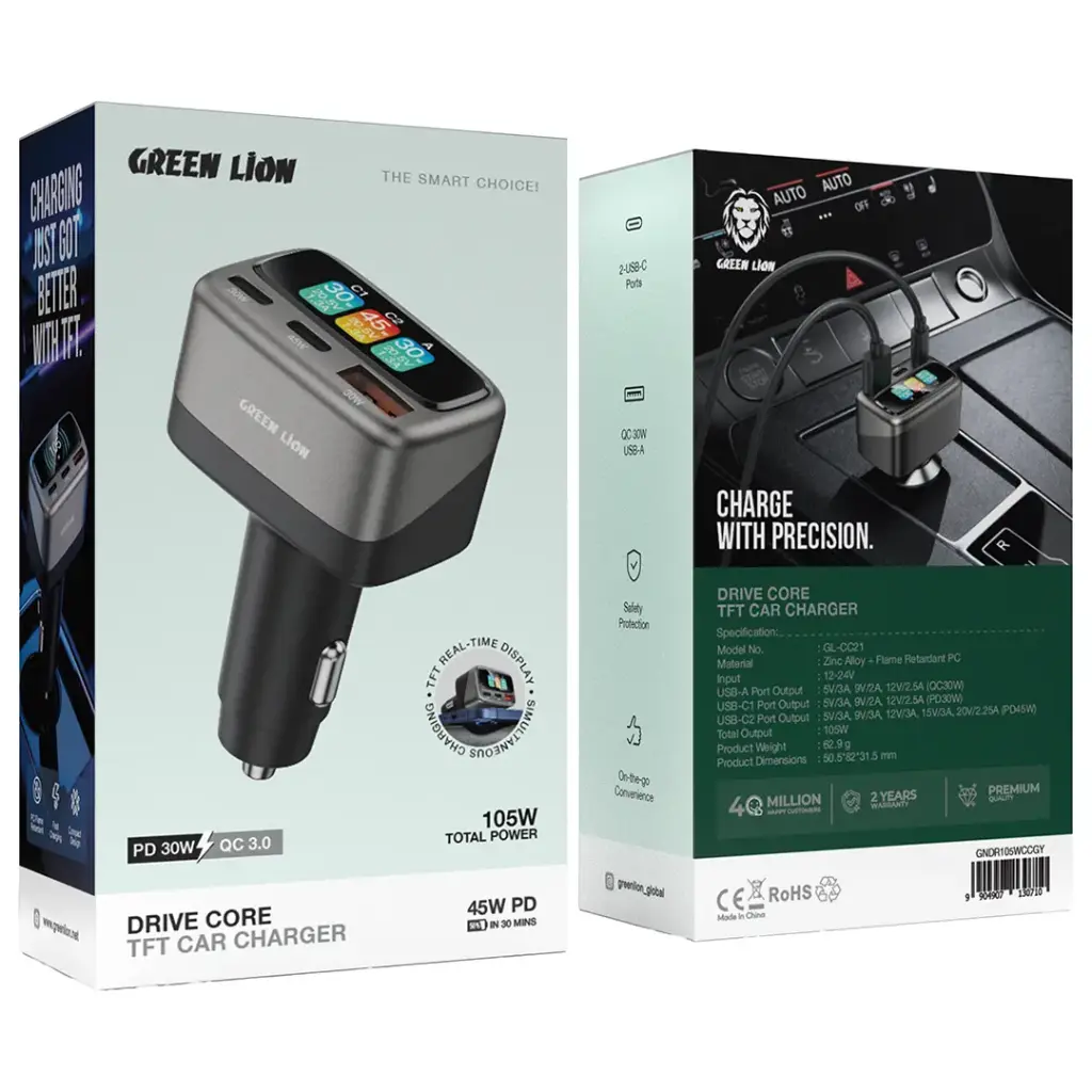 The Green Lion Drive Core TFT Car Charger – Gray serves as an advanced charging system that enables users to receive rapid and effective power distribution. The product body contains Zinc Alloy and flame-retardant PC material, which creates a durable yet safe product. The charger features two USB-C ports and a USB-A QC30W port, which together provide a total power output of 105W. The USB-A port delivers 5V/3A, 9V/2A, and 12V/2.5A, while the USB-C1 port supports up to 30W (PD) and the USB-C2 port offers fast charging with up to 45W PD for optimal device charging. The real-time TFT display provides current charging status information. The product design enables easy transportation because it uses a compact design that maintains safety features for secure operation. The charger provides rapid and effective device charging for users who travel by foot or vehicle.