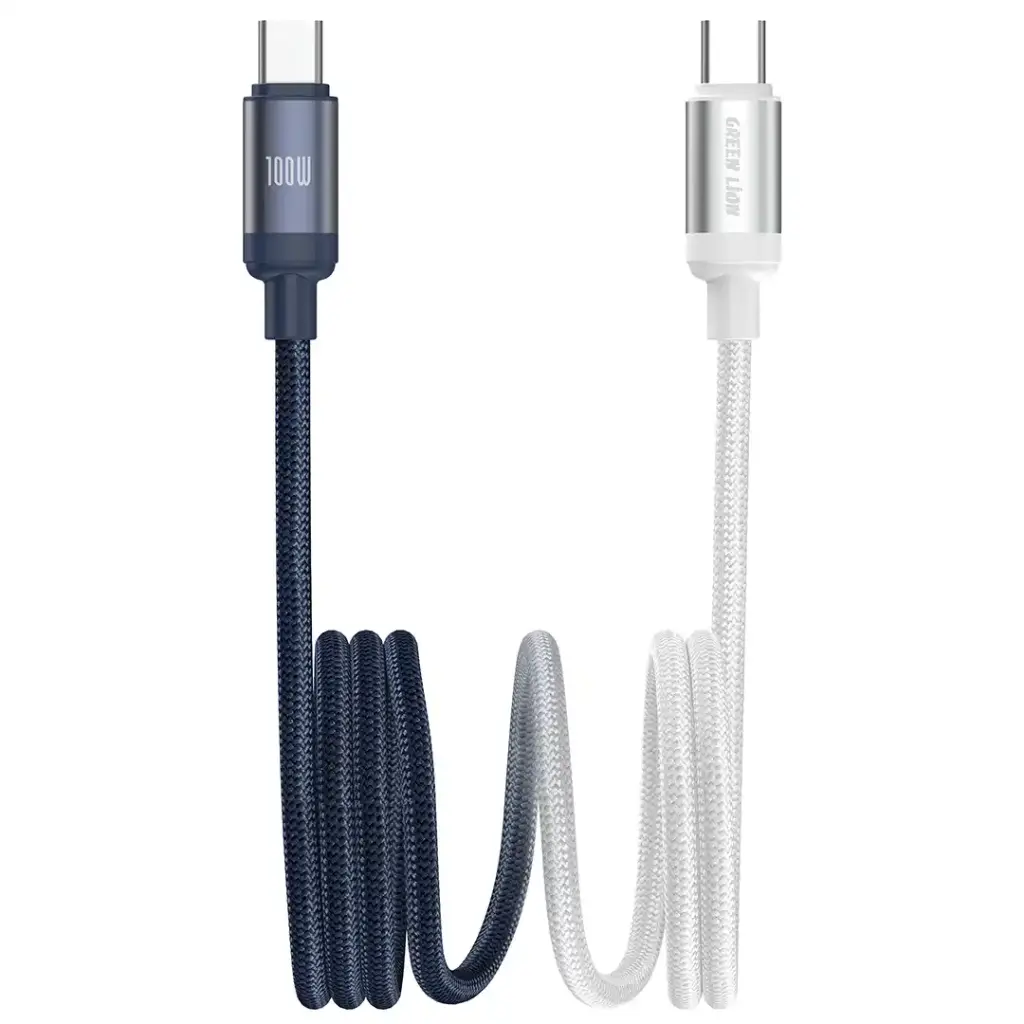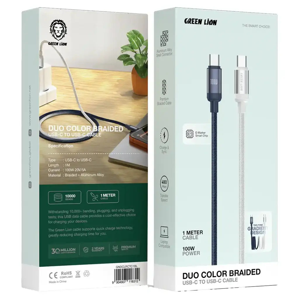 The Green Lion Duo Color Braided USB-C to USB-C Cable combines stylish design with strong construction and high-performance capabilities. The 1-meter cable delivers fast charging services which can supply power up to 100W(20V/3A) to multiple devices, including laptops. The premium braided material and aluminum alloy shell connector ensure long-lasting durability and resistance to wear and tear. The E-Marker smart chip enables this cable to deliver both safe charging and reliable data transmission. The 480Mbps transfer speed enables you to synchronize your files with your devices in a quick manner. The contemporary two-tone gradient design enhances the visual appeal of your equipment setup. This cable delivers high-speed charging performance, which works with all USB-C devices you own, from phones to tablets and laptops. The Green Lion Duo Color Braided USB-C to USB-C Cable allows you to transfer data and charge your devices at high speeds.