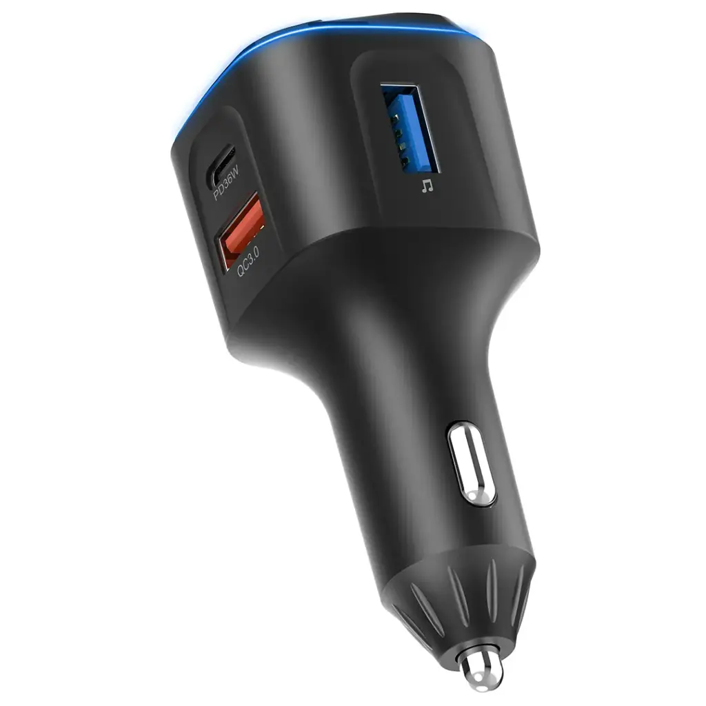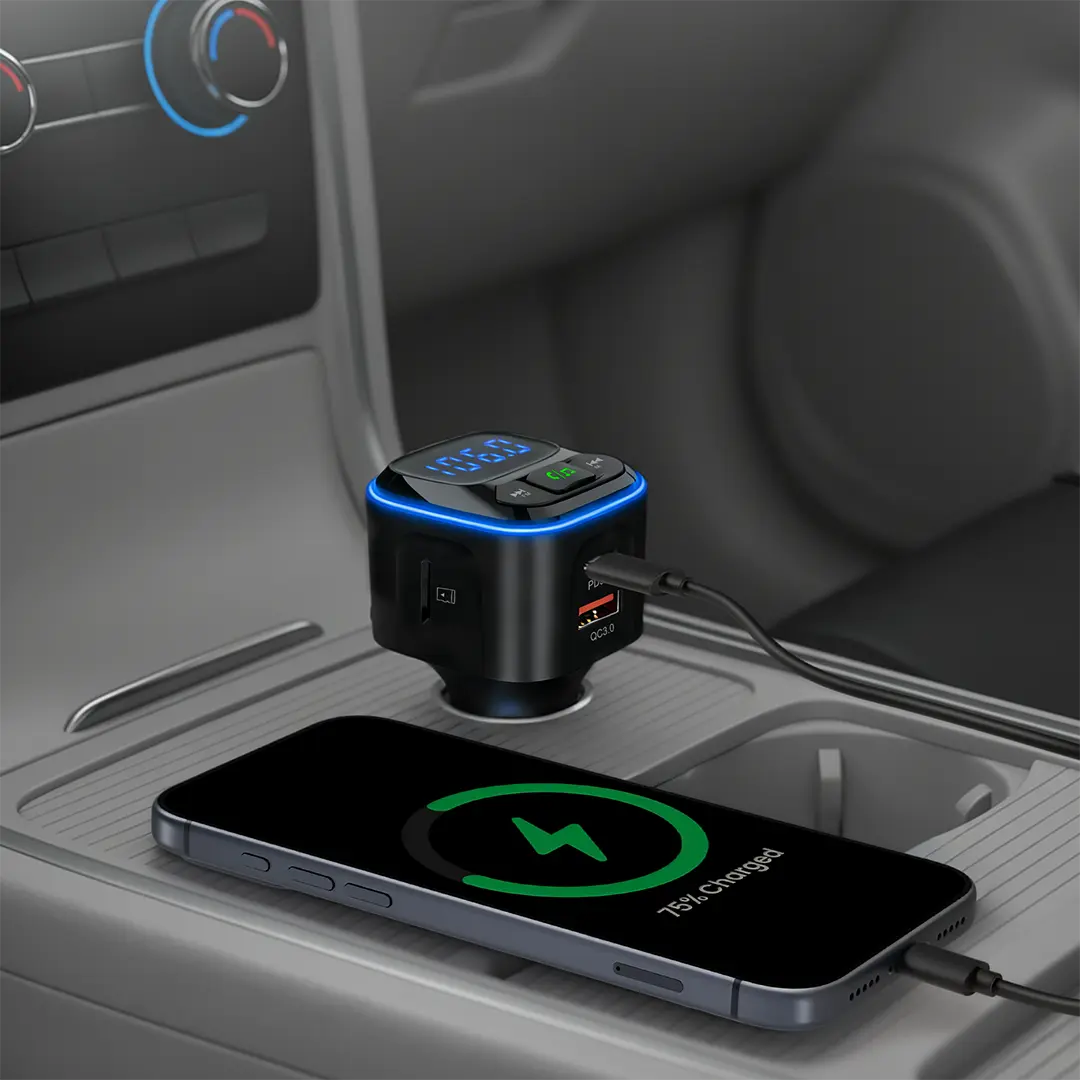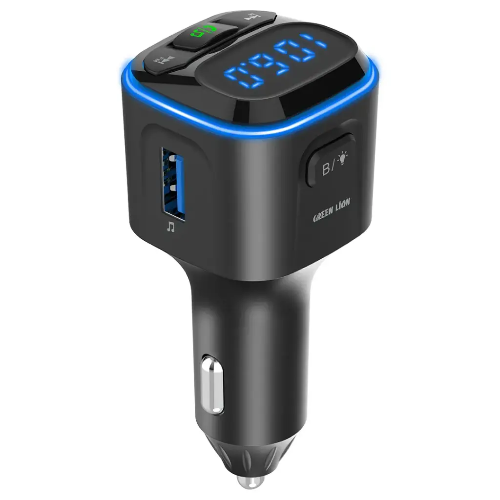 The Green Lion FM Transmitter Dual-Port Car Charger in black serves as the best choice for drivers who need to charge their devices and enjoy entertainment during their trips. The device uses Bluetooth V5.3 technology to provide users with wireless access for making hands-free calls and streaming music. The USB-A port supports QC 3.0 18W, while the USB-C port offers PD36W for fast charging of your devices. You can use the built-in FM transmitter to broadcast music through your car radio because it operates between 87.5 MHz and 108.0 MHz frequencies. The ambient breathing light adds a modern touch, while the bass boost button enhances your audio experience. The system allows you to handle calls and music playback through voice commands using Siri and Google Assistant. The charger also features a smart LED display with voltage monitoring for real-time charging updates. The system allows users to play music from U-Disk and TF cards that have a maximum capacity of 32GB, which makes it possible to create an extended music library for their driving experience.