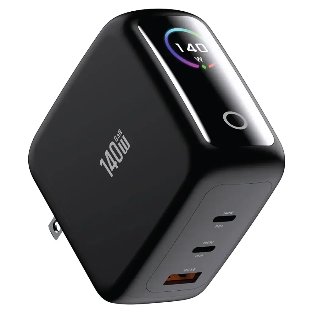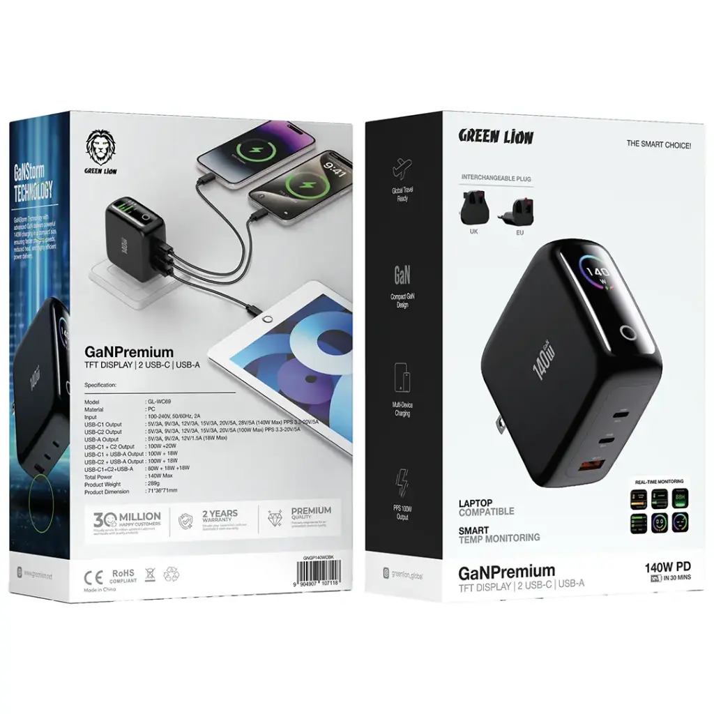 The Black GaNPremium Adapter from Green Lion is an excellent solution for fast charging of multiple devices at once. Its powerful 140W max total output allows it to be connected with two USB-C ports and one USB-A port, which makes it perfect for charging all kinds of devices from smartphones to laptops. USB-C1 takes care of up to 140W using (PPS) whilst USB-C2 sends out 100W, thus guaranteeing quick and effective charging for your gadgets. The USB-A port gives 18W max, which is just right for low-power devices. With a TFT screen, the adapter displays real-time charging status while smart temperature control keeps the circuitry safe. The gadget is universal since it comes with the three types of plugs: UK, EU, and US, so it meets all requirements for worldwide use. Whatever the location may be—home, office, or travel—the Green Lion GaNPremium Adapter will take care of your charging requirements quickly and easily.