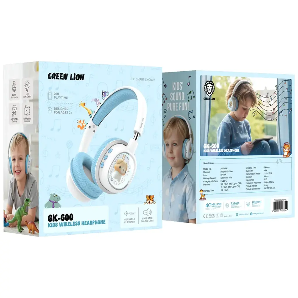 The Green Lion GK-600 Kids Wireless Headphones provide safe listening through their 85dB sound limit, which allows children to enjoy music for 20 hours. The headphones enable users to watch movies and play games through Bluetooth V5.4 and AUX mode, which they use to play music. The LED light design creates an interactive experience for children, while the soft padded cushions provide comfort during extended listening. The built-in microphone provides clear communication, which works well for online classes and video calls. The headphone controls designed for children allow them to operate the device without any trouble. The adjustable headband ensures a secure fit, and the USB-C charging interface provides quick and efficient charging, which offers 2 hours of full charge time. The headphones deliver 60 hours of standby time, which makes them suitable for travel and daily activities while providing strong performance and enjoyable features.