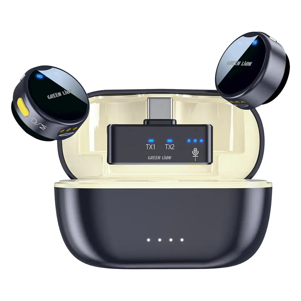 The Green Lion GM-92X Wireless Microphone, available in black, has been made for creators who require crystal clear audio and do not want to be bothered by technical issues. The microphone, which is designed as an omnidirectional microphone with a 360° range, picks up voices in a very natural way from all sides and thus perfectly fits the use in interviews, vlogs, presentations, and live recordings. Its instant recording feature, thanks to the plug-and-play setup, allows you to start recording without the need for apps or pairing and the like. Wireless transmission at 2.4GHz guarantees a steady connection with an extended range of up to 40 meters, and ultra-low latency keeps the audio perfectly synchronized. Noise cancellation and a 20dB noise reduction rate contribute to the cleaning up of sound by eliminating background noise. The dual mic recording functionality allows for the simultaneous use of two microphones, and the reverb mode applies in cases where more richness is required. The compact design of the clip-on type microphone makes it both comfortable and invisible, while its LED indicators show the status of the microphone at a glance. The GM-92X offers a hefty 20 hours of total use, including the charging case, so it is always ready when the creative juices flow.