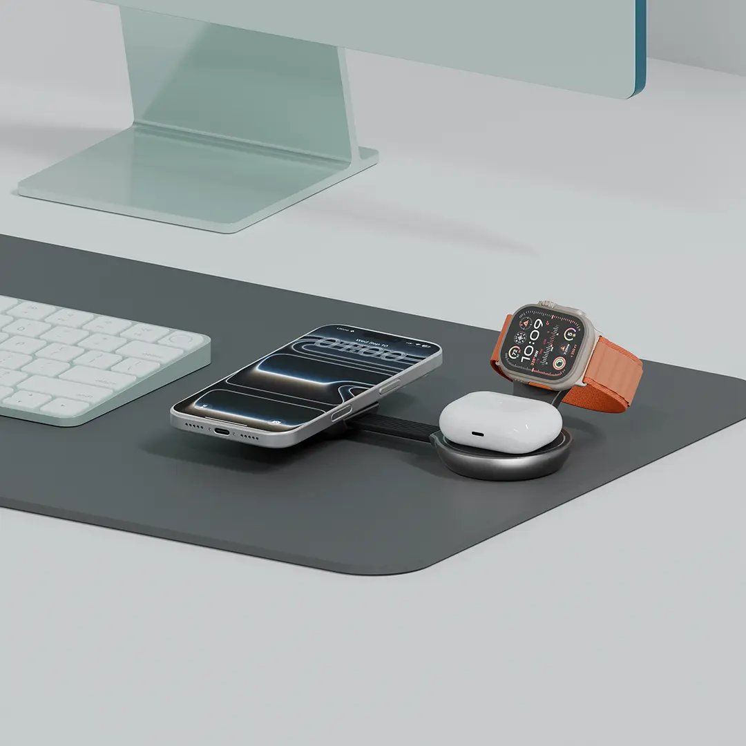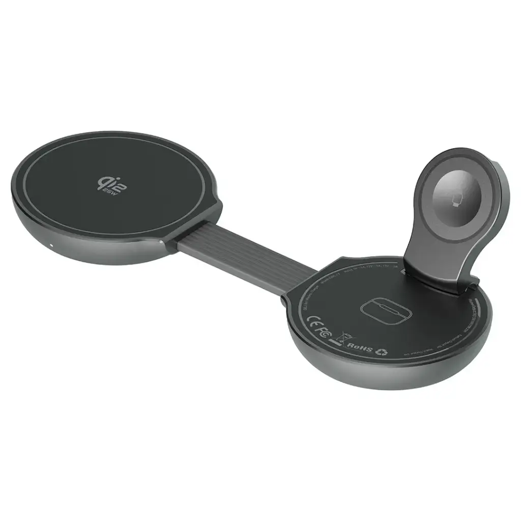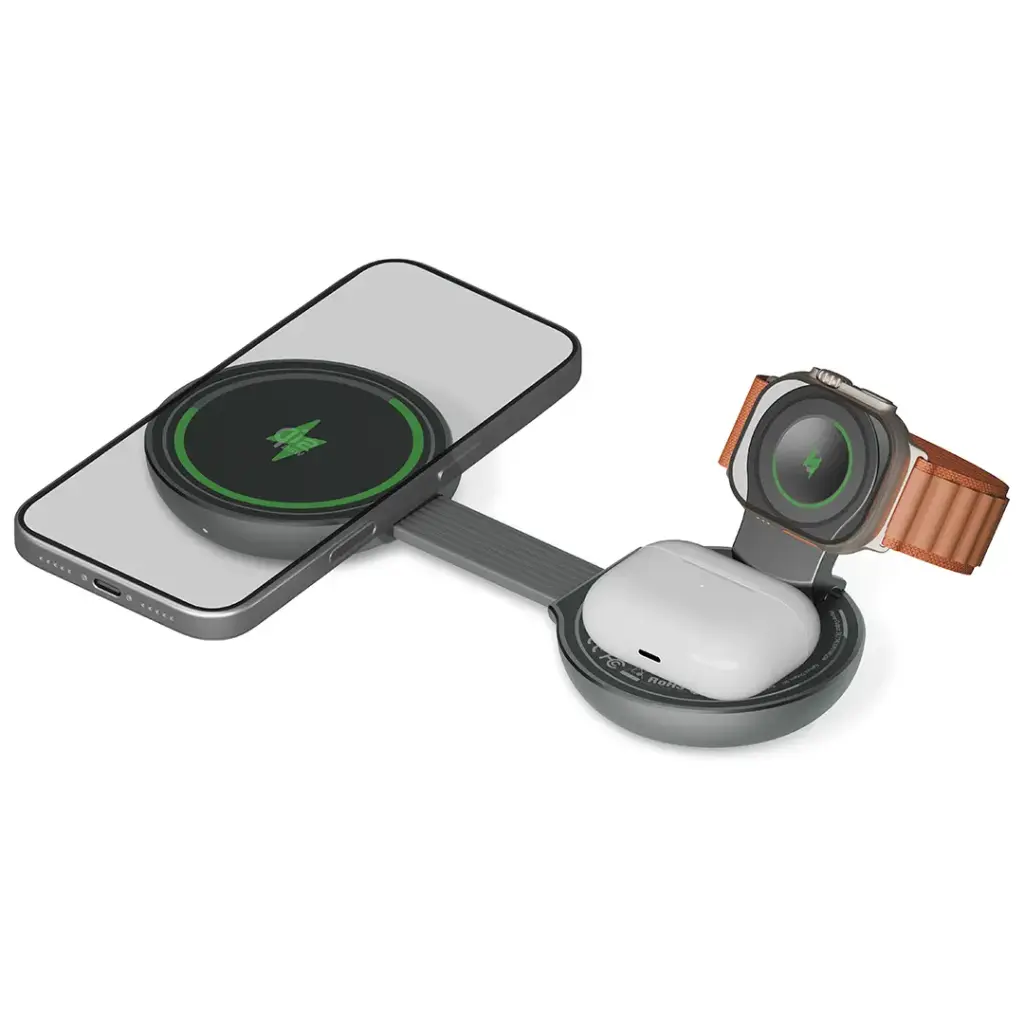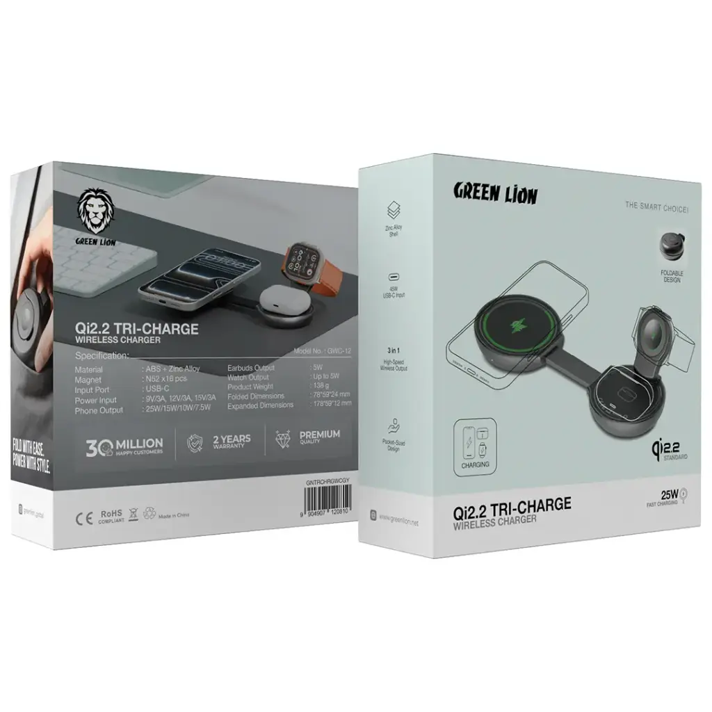 The Green Lion Qi2.2 Tri-Charge Wireless Charger in gray serves as an effective charging solution that supports all your devices. The compact charger features a foldable design, which enables users to charge their smartphones, earbuds, and smartwatches at high speed through its 3-in-1 wireless charging system. The charger supports the Qi2.2 standard, which delivers safe and fast charging through its multiple power outputs that include 25W, 15W, 10W, and 7.5W for phones and 5W for earbuds and up to 5W for watches. The device holds 16 N52 magnets, which create a powerful magnetic grip that keeps your devices securely in place during the charging process. The 45W USB-C input provides fast power delivery, which results in shortened charging durations. The zinc alloy shell protects the device while maintaining a high-quality appearance, and the device’s pocket-sized design enables users to carry it easily. The Green Lion Qi2.2 Tri-Charge Wireless Charger provides dependable charging solutions that work effectively both at home and while traveling.