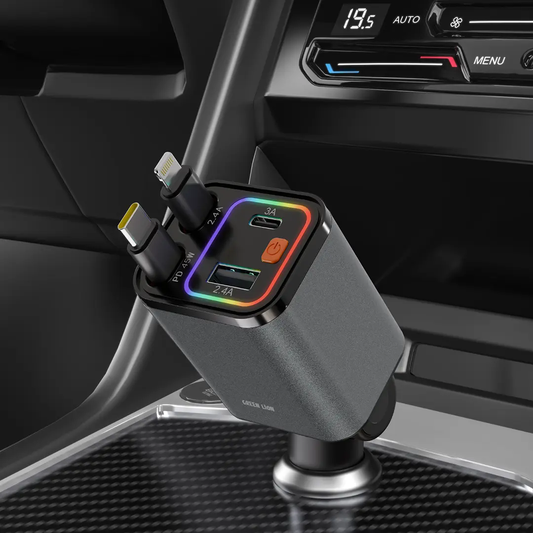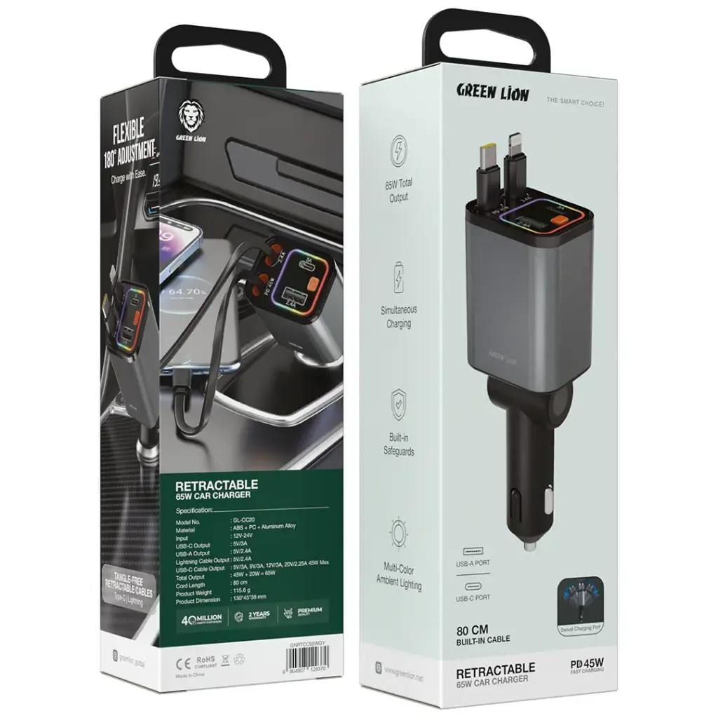 The Green Lion Retractable 65W Car Charger in grey provides fast and efficient charging solutions that operate effortlessly during your travels. The 65W total output enables quick device charging through its USB-C port, which supports PD 45W fast charging, and its USB-A and Lightning cable outputs provide various charging options. The 80cm retractable cable prevents tangles while providing easy use, and the swivel charging port enables 180° rotation, which lets users charge devices from any location inside their vehicle. The charger has multiple ambient light colors, which enhance the aesthetic appearance of your vehicle’s interior. The device charging process maintains safety through built-in protections that operate during multiple device charging sessions. This charger uses ABS PC and aluminum alloy materials to create a robust design that provides maximum charging convenience for users who travel.