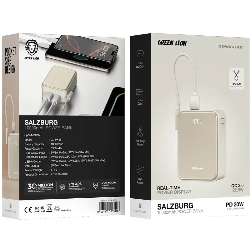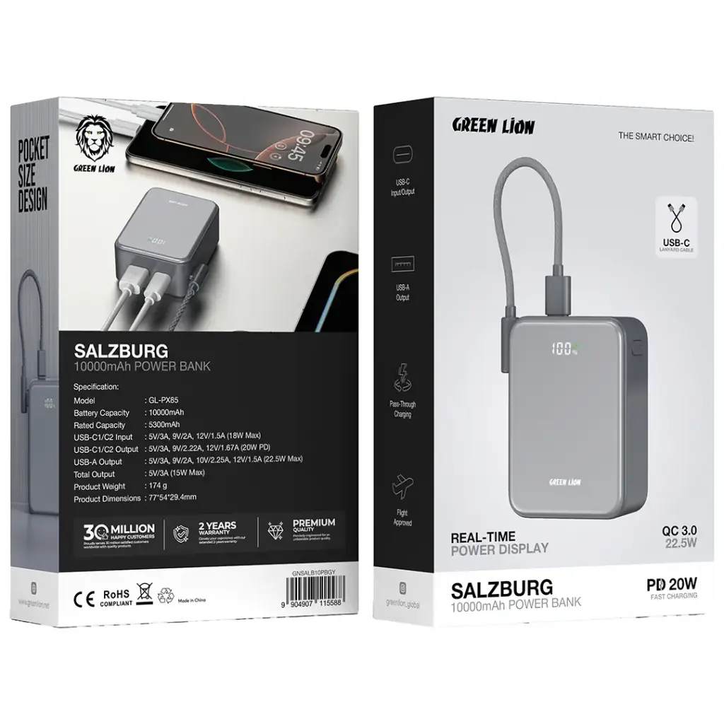The Green Lion Salzburg 10000mAh Power Bank is a product that rises above the rest in terms of quality and usability. In other words, it has a 10000mAh battery capacity and a 5300mAh rated capacity, so it will be able to support a lot of devices. Its output from USB-C1/C2 supports PD 20W fast charging, while the USB-A output provides up to 22.5W, making it most suitable for quick device recharge. The USB-C input/output takes the hassle out of charging both the power bank and devices connected to the power bank. You have the option of charging your devices and your power bank simultaneously at the same time, as the power bank has pass-through charging. A real-time power display is also available to keep track of the charging process. The USB-C lanyard cable that comes with it is for your convenience in case you want to carry it around. Pretty much passable as luggage on an airplane, the Salzburg power bank is small enough to fit into your pocket and very suitable for traveling, or just out for the day. Don’t let the day drain your device – rely on this fast-charging solution!