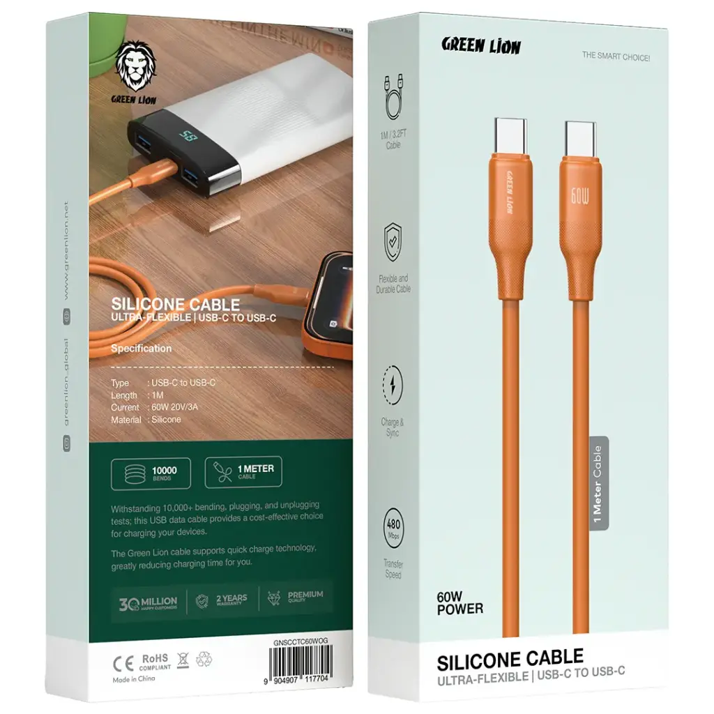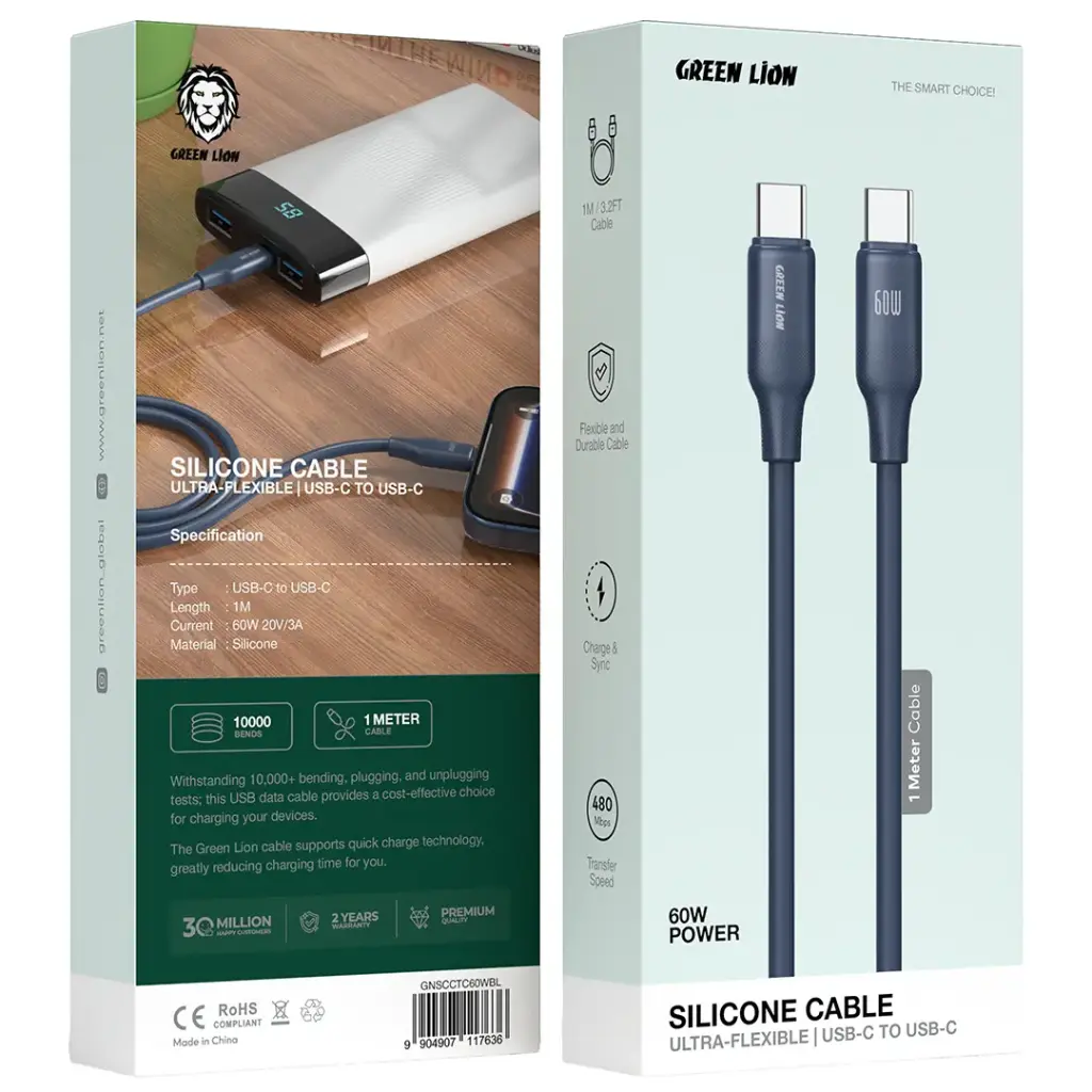 The Green Lion Silicone USB-C to USB-C Cable Ultra-Flexible offers a reliable and durable solution for your charging and data transfer needs. The cable supports fast charging through its 1-meter (3.2 feet) length, which delivers 60W current (20V/3A) power. The high-quality silicone material of the product provides both flexible and durable properties, which enable it to withstand daily usage. The cable provides a seamless connection between devices, which allows users to charge their devices and sync their data. The system enables fast data transfers at 480Mbps between USB-C devices because it supports this transfer speed. This cable delivers optimal performance for all your smartphone, tablet, and laptop charging needs. The product features an ultra-flexible design, which enables users to use and store the product easily, while its rugged construction guarantees an extended product lifespan. The Green Lion Silicone USB-C to USB-C Cable provides users with a reliable connection that delivers high-speed data transmission.