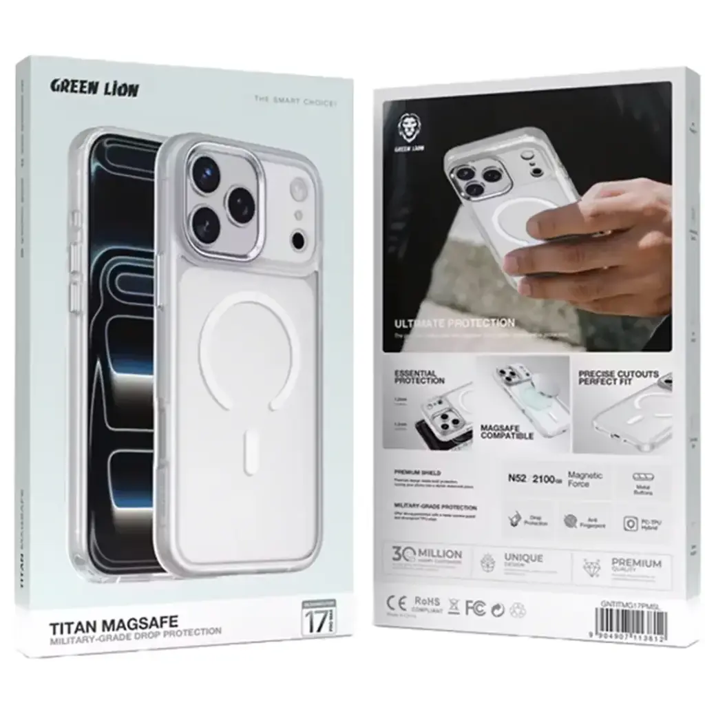 The Green Lion Titan MagSafe Military-Grade Case – Silver for iPhone 17 Pro is undoubtedly the best combination of a tough and durable protective case along with an elegant, modern case, which consequently indicates that the user obtains the most favorable combination of longevity and beauty. The protective case possesses military-grade protection and consists of a PC-TPU hybrid material with a high-quality shield as the ultimate protection for your device against falls, shocks, and the daily grind. The case’s manufacturing includes metal buttons and accurate cutouts in such a way that you can have unobstructed access to all ports and functions without compromising phone usability. The case’s fingerprint and scratch-resistant surfaces are very helpful in keeping the device looking fresh and new, while the shock-absorbing structure provides the required impact protection. Being totally compatible with MagSafe ensures an easy connection to chargers and accessories for hassle-free wireless charging. The Green Lion Titan is not only a protector for your iPhone 17 Pro but also a keeper of its chic look by offering drop protection, a comfy grip, and vital protection features. The silver color gives a luxurious and sophisticated appeal to it, hence making it a convenient and stylish choice for daily use at the same time.