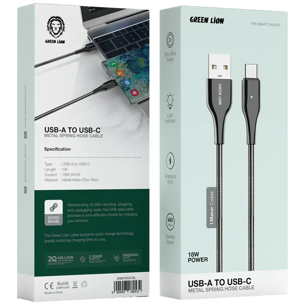 The Green Lion Metal Spring Hose Cable is a durable and efficient solution for charging and data transfer. Its metal spring hose design and zinc alloy finish make this cable almost indestructible and tangling-free at the same time. The supported transfer speed is 480Mbps, which is fast enough for a quick refresh of files and for uninterrupted charging of your devices. The USB-A to USB-C connector makes this cable very versatile and suitable for many devices. The light indicator that shows when the cable is charging is an added convenience to your experience. The Green Lion Metal Spring Hose Cable can deliver high-quality performance, fast charging, and reliable data transfer in a sleek, compact design when you are charging or syncing your phone or tablet. It is the perfect choice for everyday and travel use.