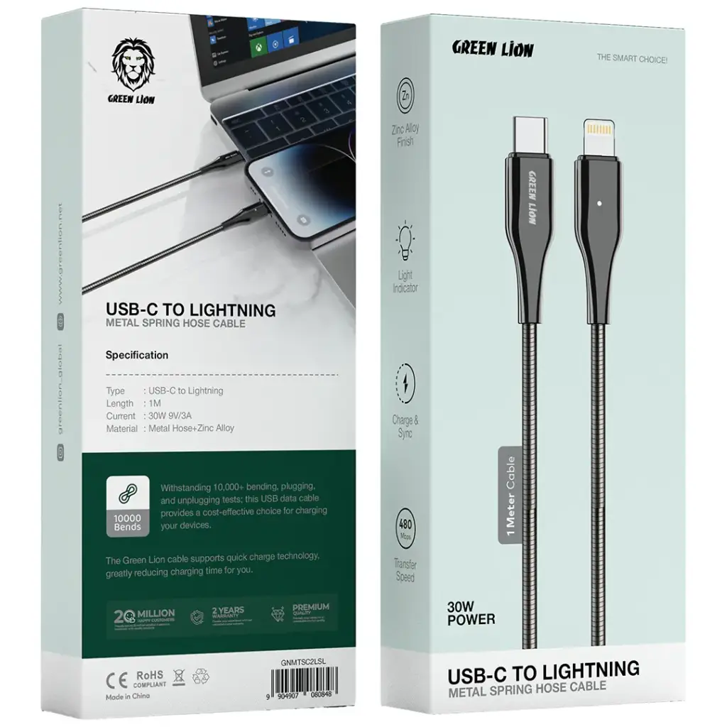 Green Lion USB-C to Lightning Metal Spring Hose Cable – Silver is a top-shelf product because of its long-lastingness, beauty, and high-quality performance. This cable, equipped with the metal spring hose technology, is a very strong one, and at the same time, it is not annoying because it does not tangle. Zinc alloy finish also adds to its modern and stunning looks, and it even adds richness to it. Moreover, its functionality is very good, and still, the cable does not get in the way of your other high-tech devices. The fast charging and quick device connection are made possible by USB-C to Lightning connectors, and at the same time, the data transfer speed is 480Mbps, so no synchronization hassle at all. This premium cable is ideal for iPhone, iPad, or other devices of the same capability because it secures both charging and data transfer that are reliable and effective. Its compact 1m length makes the cable portable, hence, it is easy to carry. Green Lion USB-C to Lightning Cable is the best in everyday use as it is the perfect blend of performance and style.