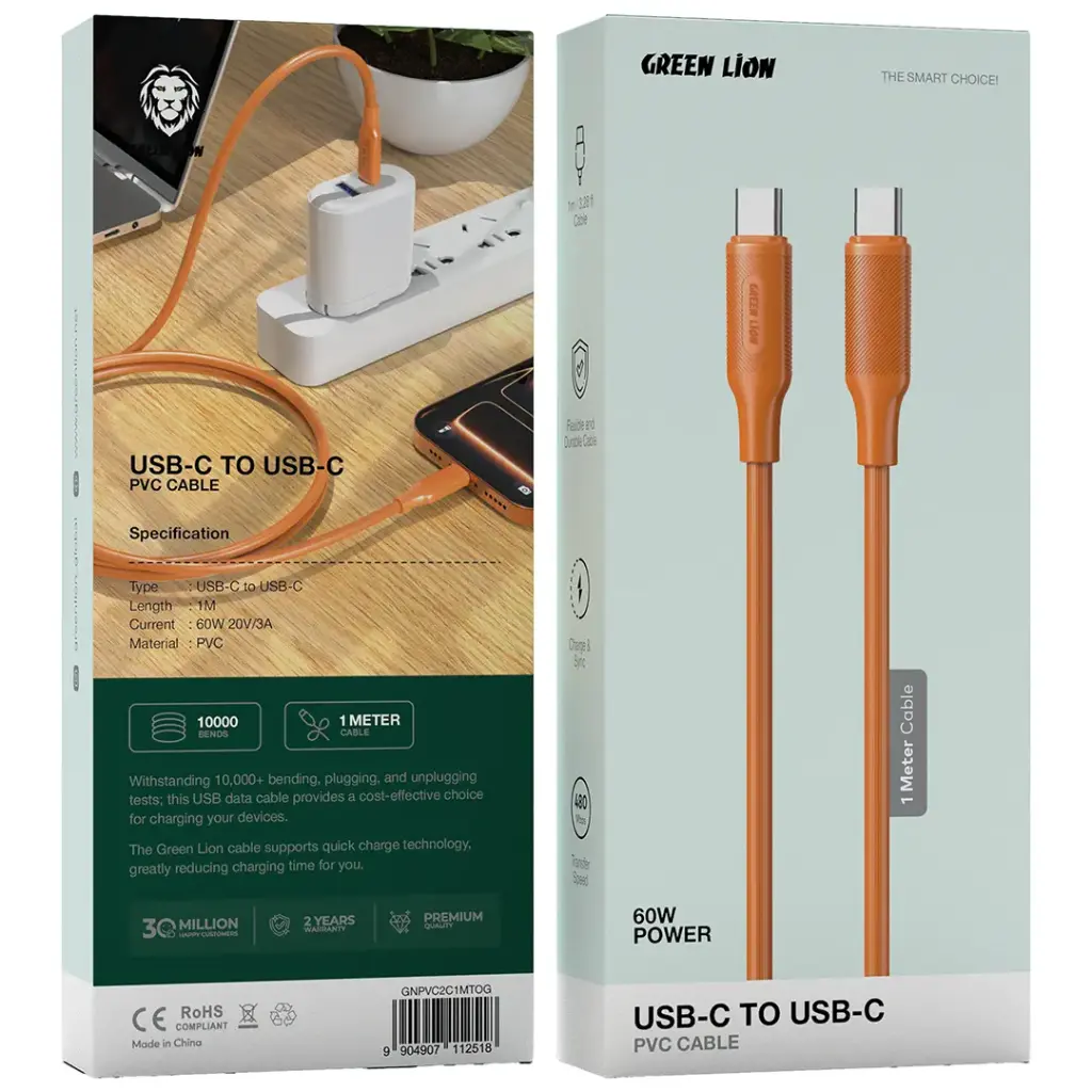 The Green Lion USB-C to USB-C PVC Cable presents an excellent option for charging and data transfer with its high-performance characteristics. This 1-meter (3.28 ft) cable offers the features of flexibility and durability, thus being a perfect candidate for daily use. To be more specific, while charging your gadget or transferring your files, the cable is capable of delivering 60W power at 20V/3A, so very fast and efficient charging is guaranteed. Data transfer will be done with no time wasted, as the cable is operating at a speed of 480 Mbps. Its long life is promised as the cable is made of tough PVC material and can endure twisting of 1000 times, thus guaranteeing a long time of reliability and performance. The USB-C-to-USB-C configuration of the product provides a wide compatibility range with the latest devices. The Green Lion USB-C to USB-C PVC Cable, which is a reliable, tough, and fast-working cable for the dual purpose of charging and data transfer, is a very good choice for your everyday tech needs.