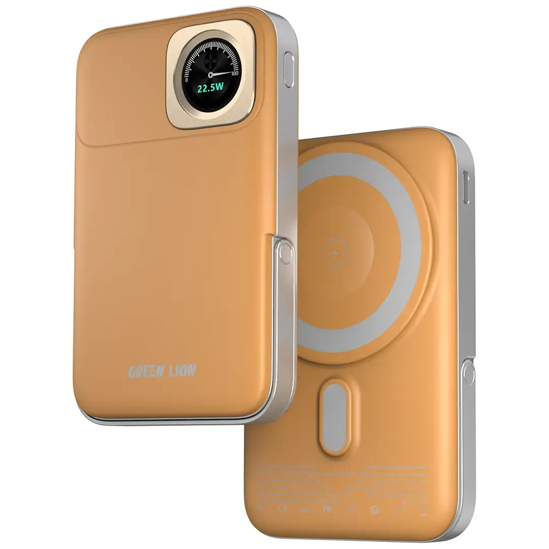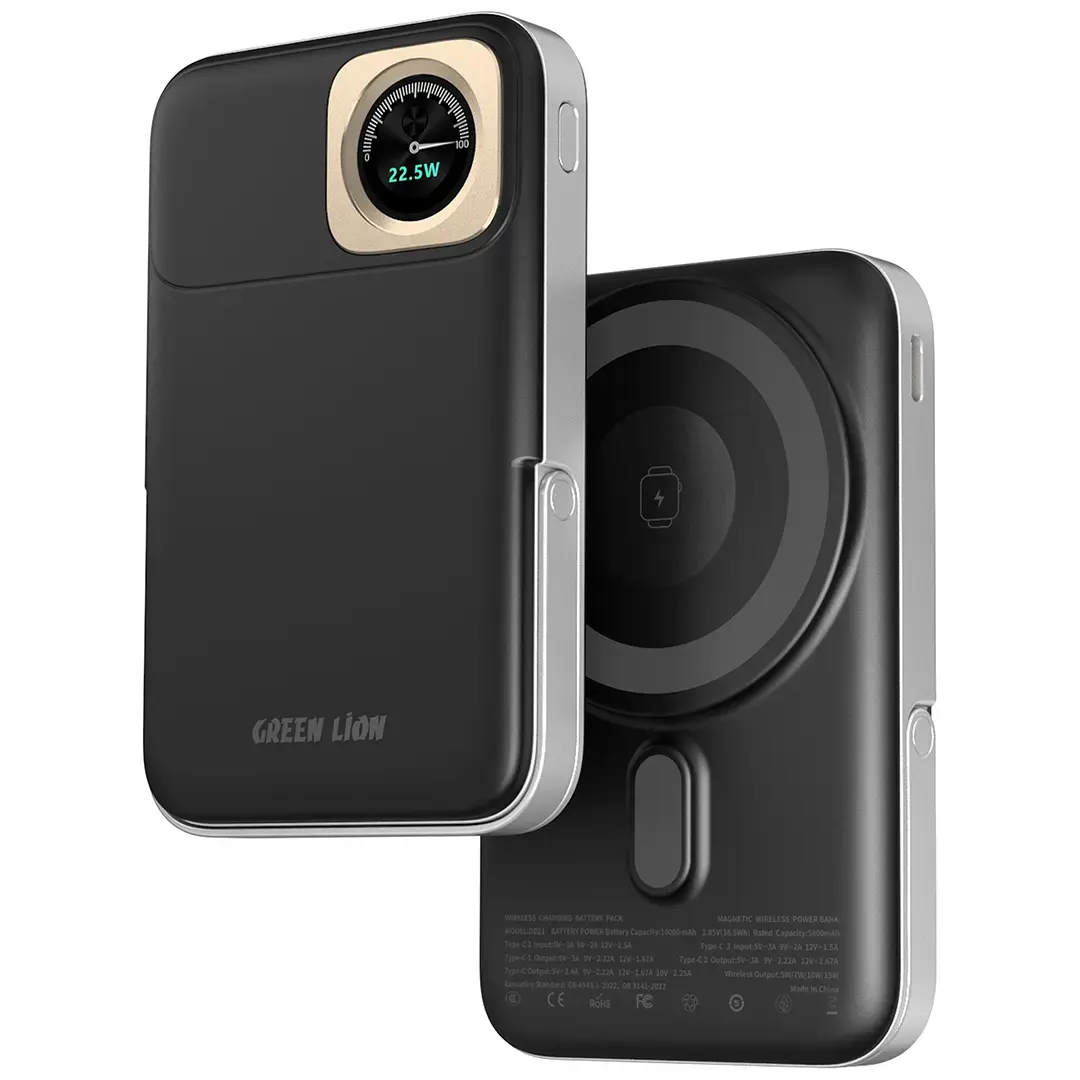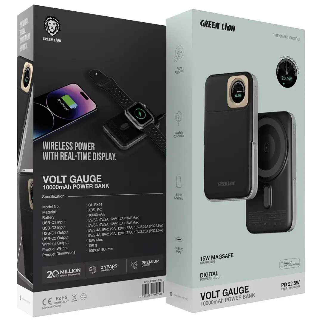 The Green Lion Volt Gauge 10000mAh Power Bank PD 22.5W is an efficient laptop, smartphone, and tablet charging device in one. Its 10,000mAh battery made from sturdy ABS + PC materials guarantees ample power whenever you need it. The dual USB-C ports allow for simultaneous charging of both and support 18W input with PD 22.5W output. The wireless output is capped at 15W, but it is MagSafe-compatible, making charging easier. The power bank’s wireless charger stand makes it easier to use the device without holding it. It is also flight-approved and comes with iWatch wireless charging, making it truly all-in-one. With MagSafe, fast charging, and a sleek, stylish look, the Green Lion Volt Gauge Power Bank is an excellent companion.