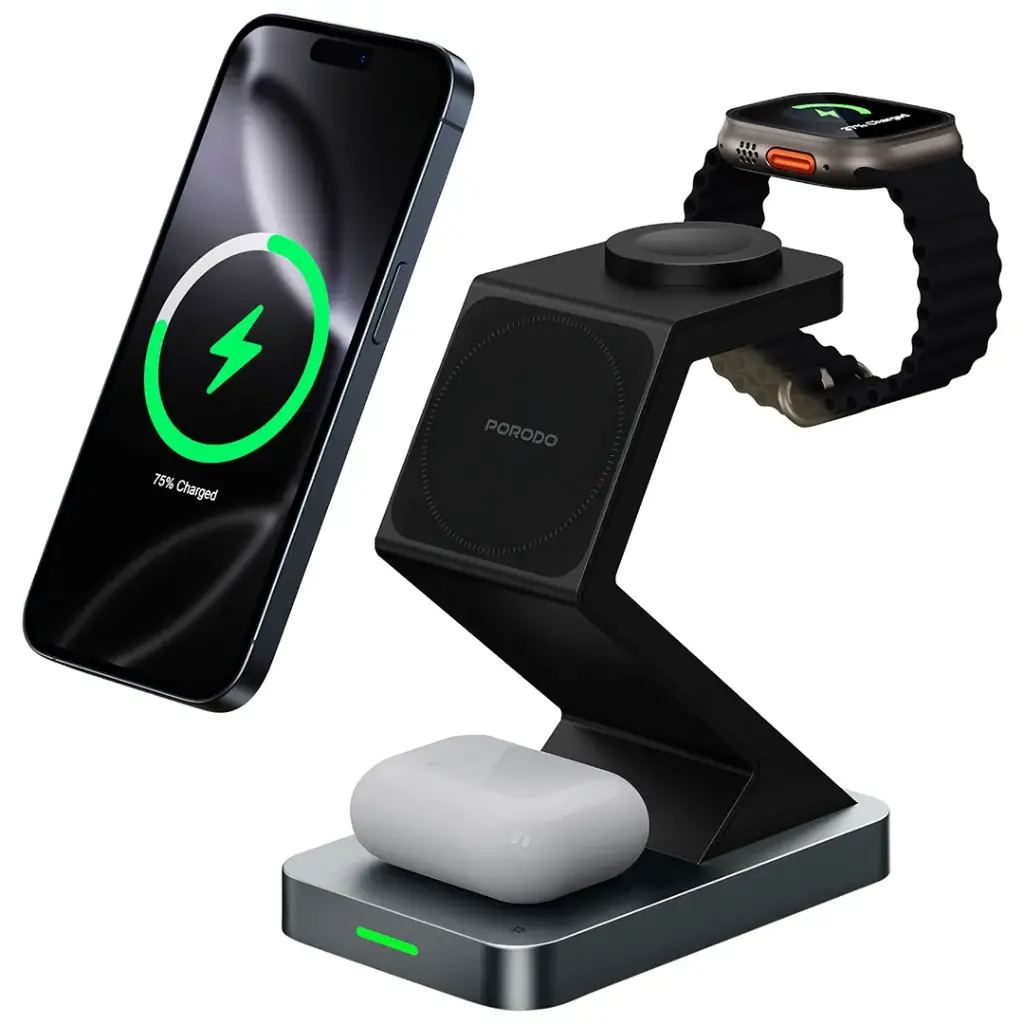 Porodo 4-In-1 Powerdock Wireless Charging Station with 360° Adjustable Viewing – Black