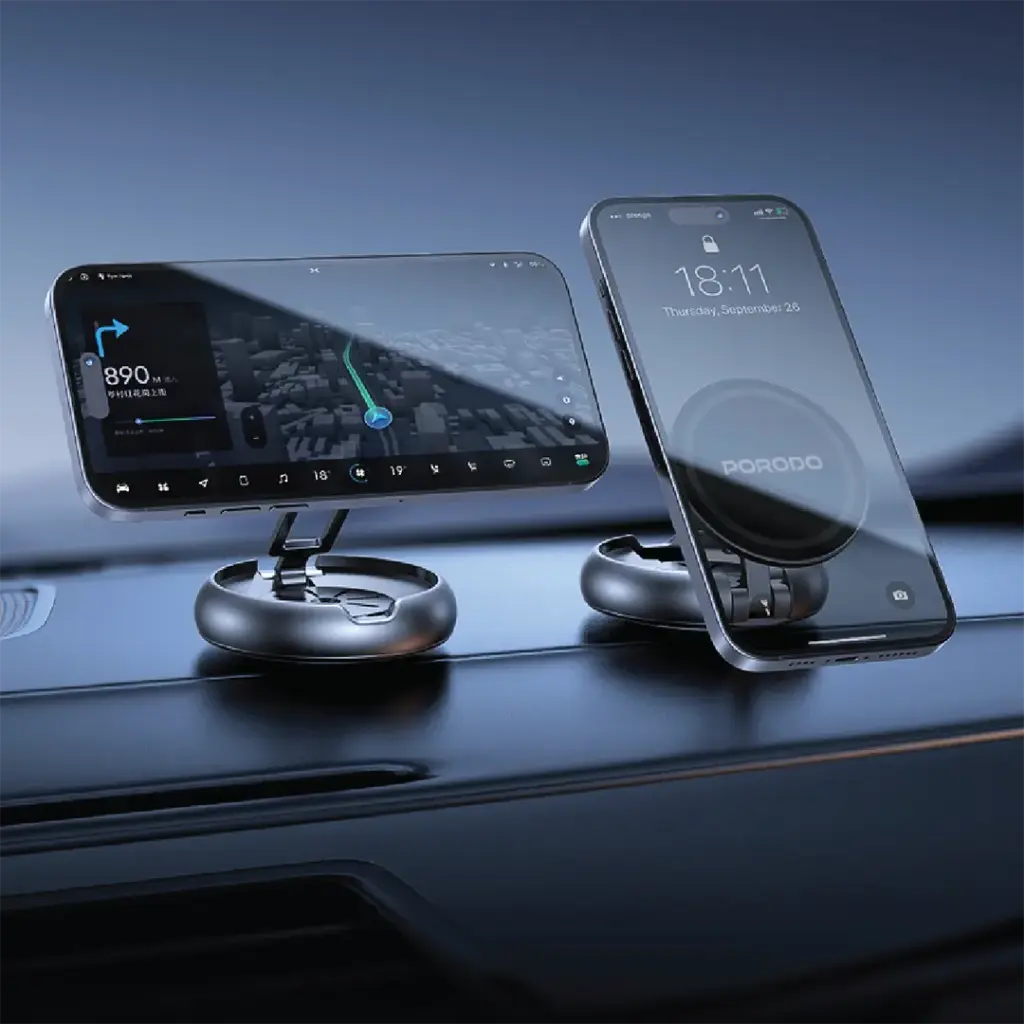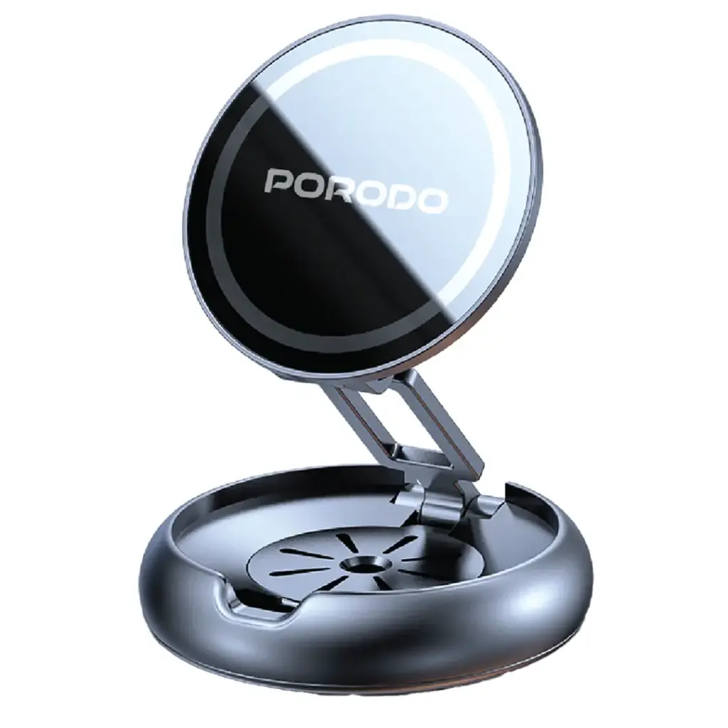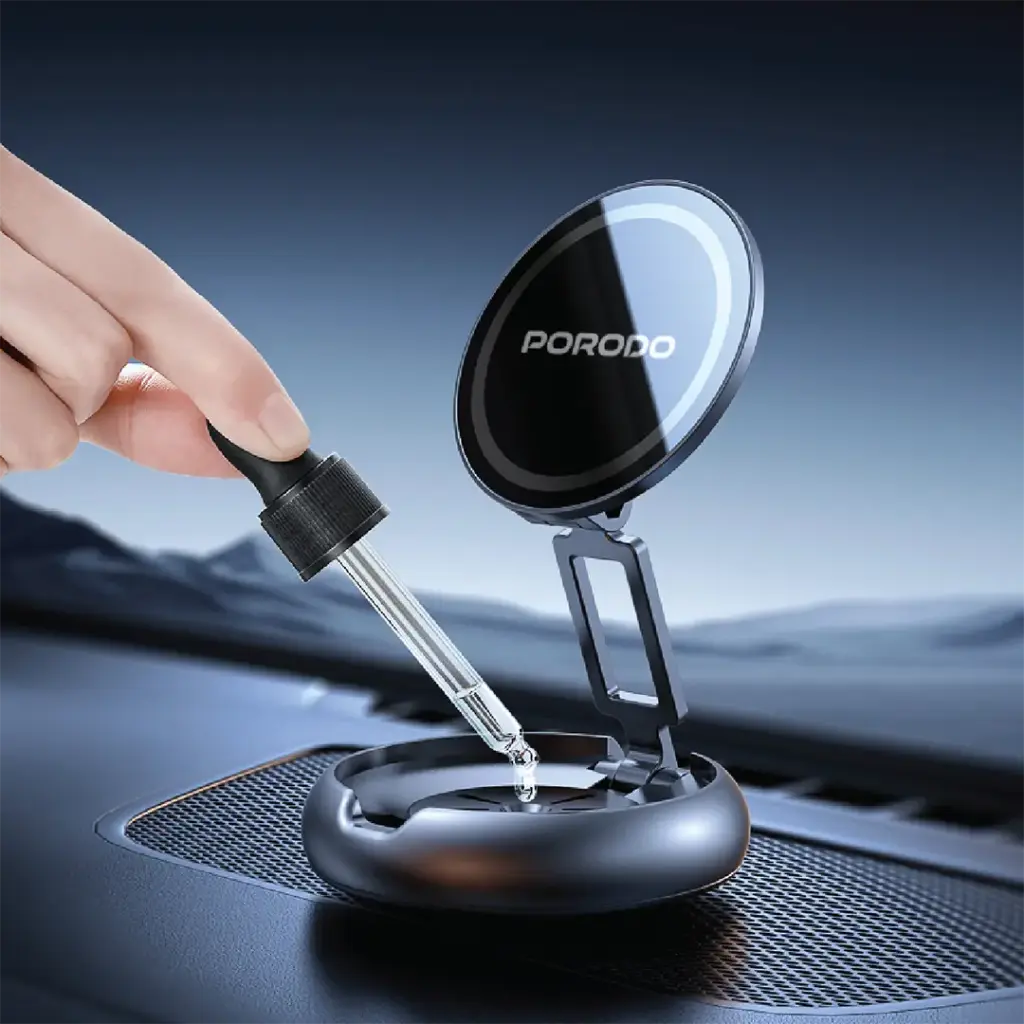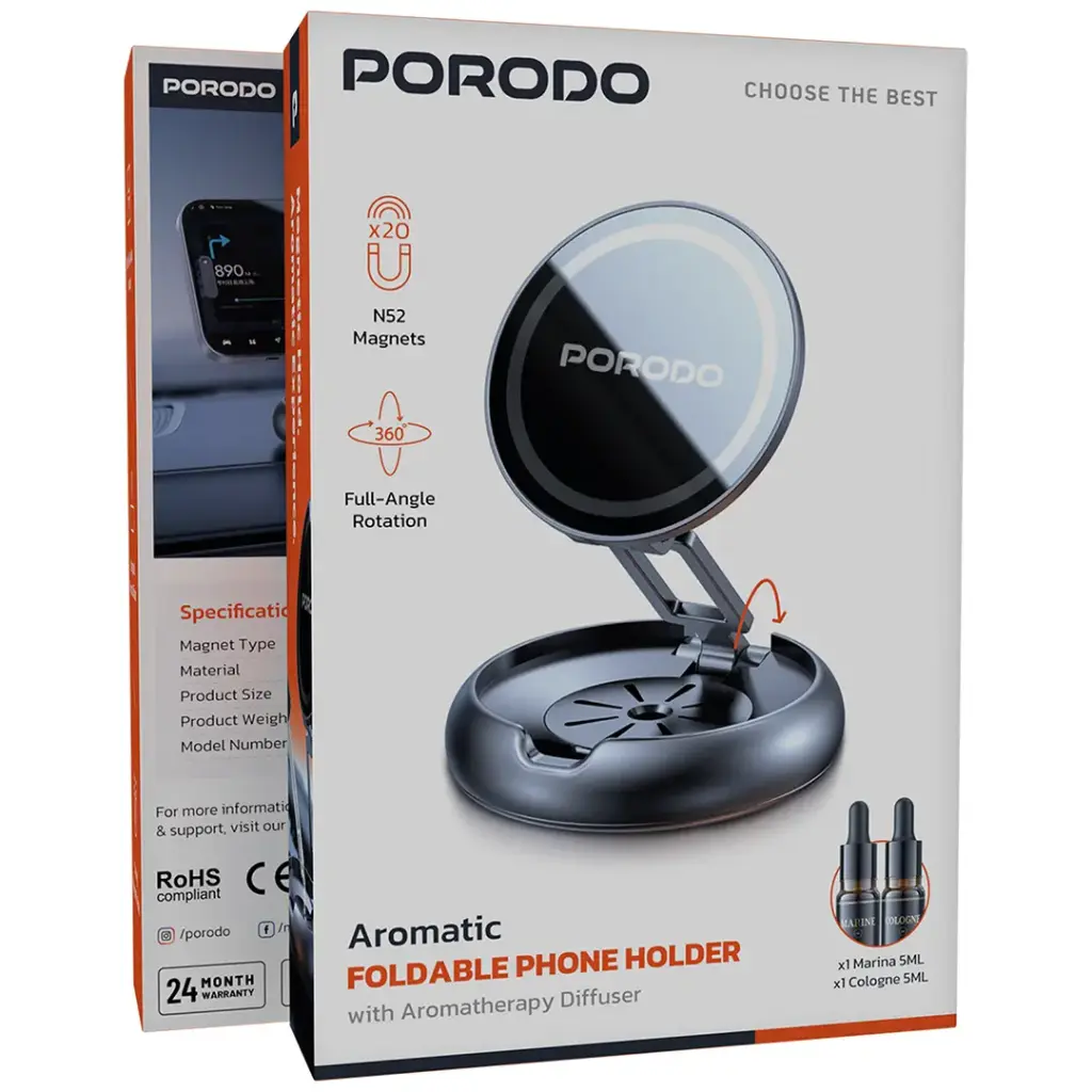 The Porodo Aromatic Foldable Phone Holder with Aromatherapy Diffuser in Gray is a product that is novel and practical at the same time. It merges mounting the phone and relaxation. N52 magnets provide a strong and secure magnetic hold, enabling the phone to be placed not only on the dashboard but also on the desk or any flat surface without falling off. Moreover, the zinc alloy construction assures the holder’s strength and longevity, while the full-angle rotation gives the user the power to place the device in any direction. The aroma diffuser that is built into the holder further generates the comfort level by releasing the good-smelling aromas that make the place more cheerful. Included are x1 Marina 5mL and x1 Cologne 5mL, which are just the right ones for making a calming scene during the day. So, this all-in-one phone mount not only serves the purpose of mounting but also comes with the extra benefit of aromatherapy, hence being the ultimate companion either in the office, car, or at home. The folding design allows for space-saving when not in use as an advantage.