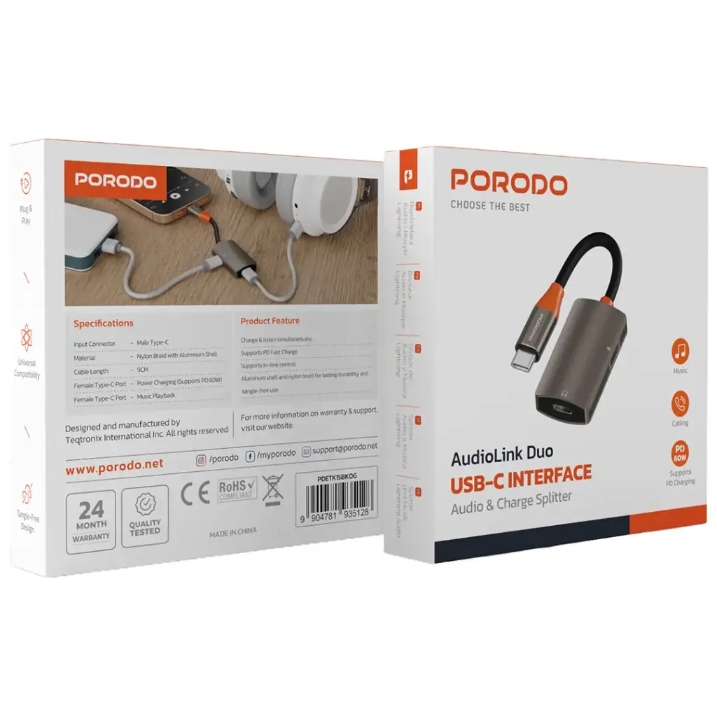 The Porodo AudioLink Duo USB-C Interface Audio and Charge Splitter serves as an ideal charger and music splitter. The durable nylon braid and aluminum shell guarantee a tangle-free experience and reliable performance. It provides flexibility and is convenient at a cable length of 9cm. The male Type-C input goes into the device, while the two female Type-C output ports cater to charging of power (supports PD 60W) and music playback. Offering plug-and-play and universal compatibility, the splitter turns out to be a general device for various appliances. Whether one is traveling or at home, the AudioLink Duo allows charging and audio for music and calls without posing any difficulty. It is the perfect concept for use on the way, anywhere where no hassle will exist for simultaneous charge and audio.