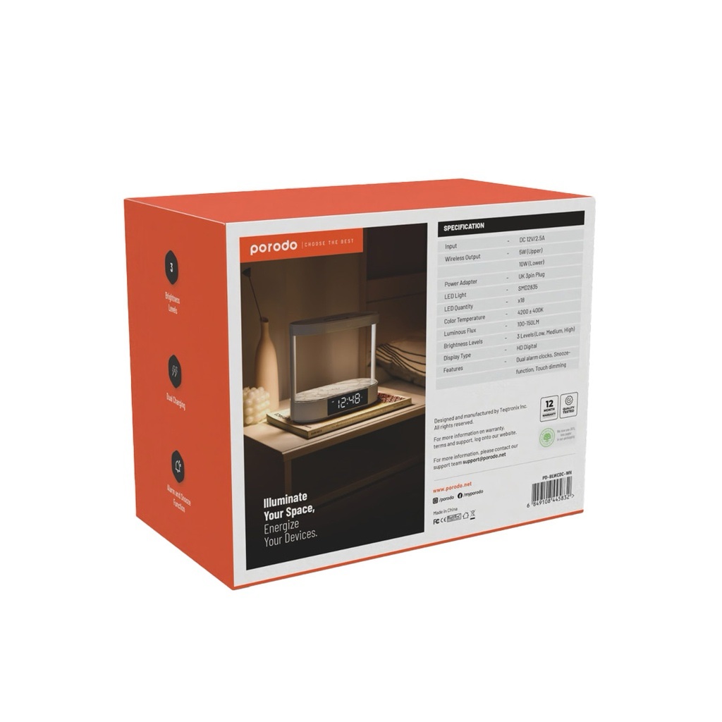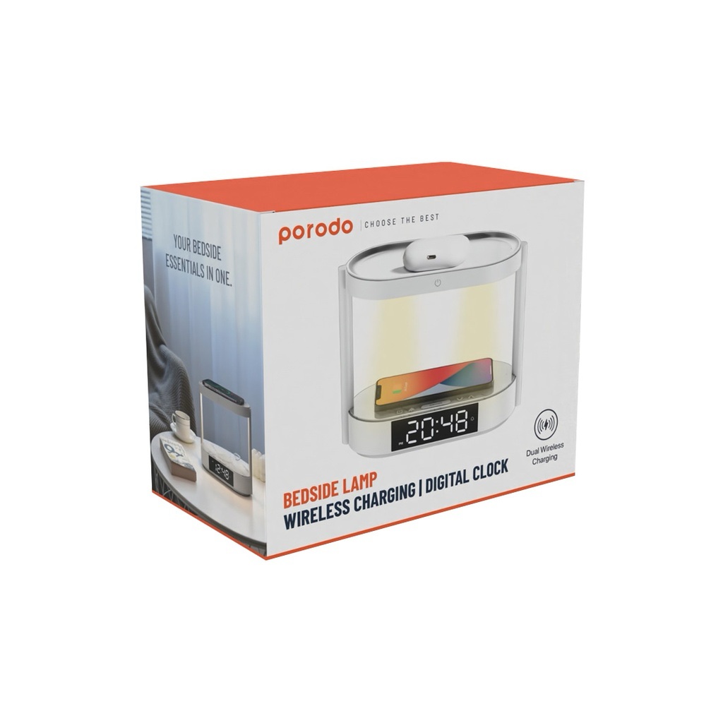 Porodo Bedside Lamp with Wireless Charger and Digital Clock – White