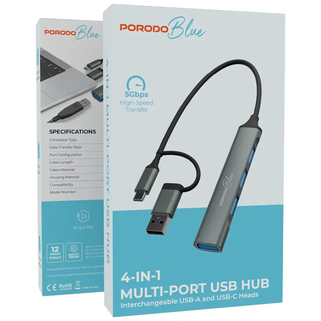 Gray Porodo Blue 4-In-1 Multi-Port USB Hub with USB-A and USB-C Heads is a flexible and effective way to increase your electronic device connections. It has 3 USB-A 2.0 ports and 1 USB-A 3.0 port, giving you fast and reliable data transfer, with speeds of 480Mbps for USB 2.0 and 5Gbps for USB 3.0. The 10cm long PVC cable gives you the option to put it in different places, while the aluminum alloy housing makes it less prone to damage, besides giving it a modern and elegant appearance. This USB hub works with a large number of systems, including Windows, macOS, Linux, Chrome OS, and Android, making it ideal for supporting several devices at the same time. The plug & play option lets you set it up easily with no need for extra software. It comes with convertible USB-A and USB-C heads so you can connect to various devices without hassle. If you need rapid data transfers or various peripherals connected, this hub gives you ultra-fast data transfer and multi-port connectivity for all your needs.