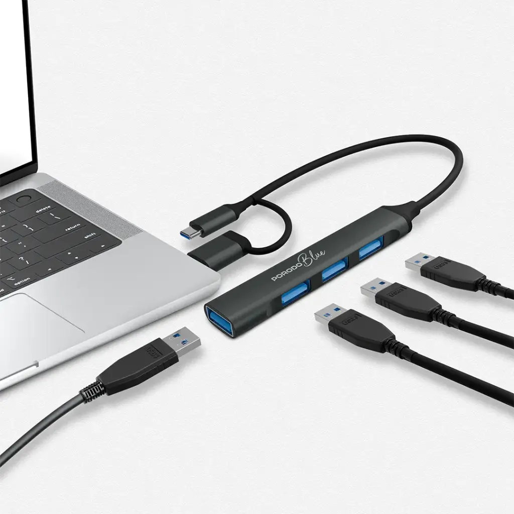 Porodo Blue 4-In-1 Multi-Port USB Hub with USB-A and USB-C Heads – Gray
