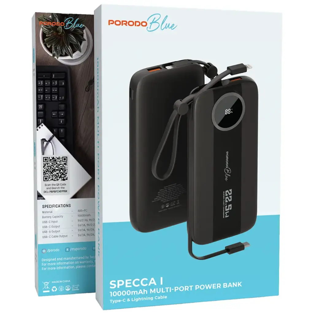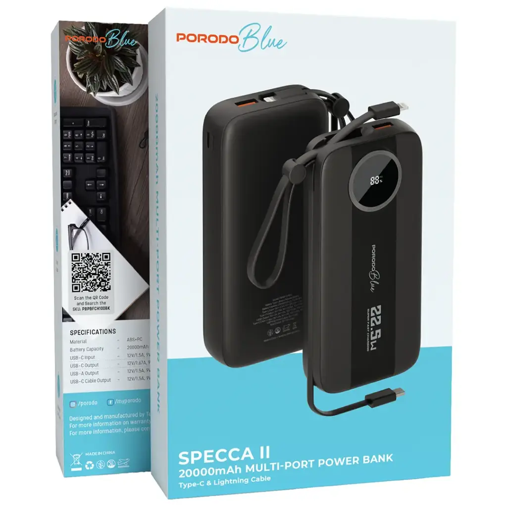 Porodo Blue Specca Multi-Port Power Bank with Type-C & Lightning Cable – Black