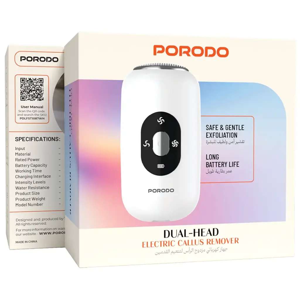 The Porodo Dual-Head Electric Callus Remover is an efficient, hassle-free, and gentle method for the elimination of hard skin and calluses on your feet. There are three strength options available, so it is very simple to set the power according to your requirement, either for soft exfoliation or for more vigorous removal. The combined head design guarantees quicker outcomes, and at the same time, it is able to treat a larger portion of the skin. The smart stall protection feature in the device makes sure that there are no pauses in the performance, and then the device will be working at its best. USB-C fast charging enables quick battery recharging along with a long-lasting battery that gives an hour of uninterrupted use. The waterproof IPX6 certification means that it can be operated in the shower, which is very convenient for a cooling foot care ritual. No matter whether it is Porodo Electric Callus Remover, one man’s soft exfoliation is another one’s tougher foot-care, but it is always the same comfortable, ergonomic solution that is safe and effective.