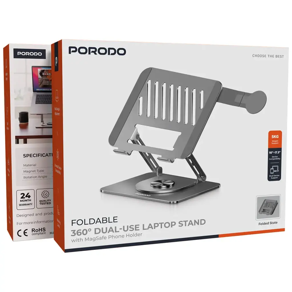 Porodo Foldable 360° Dual-Use Laptop Stand with MagSafe Phone Holder – Gray