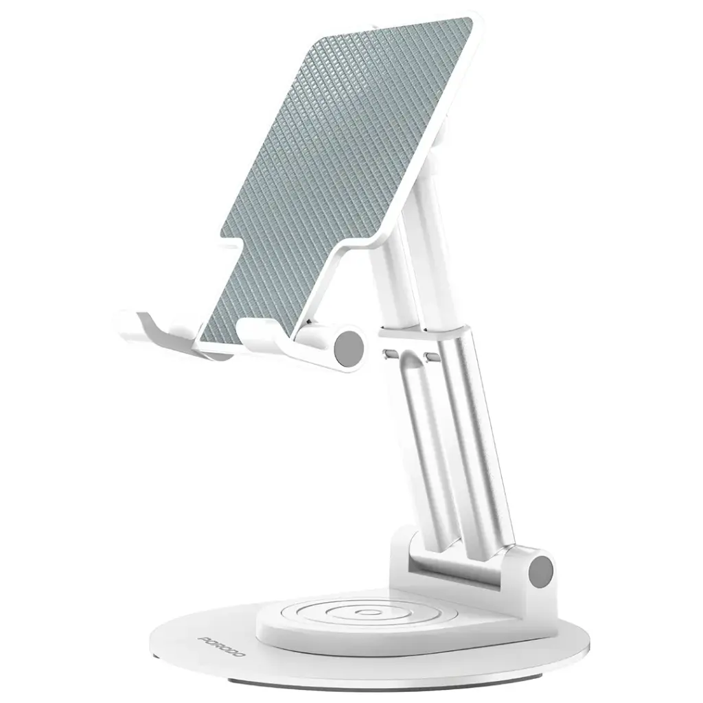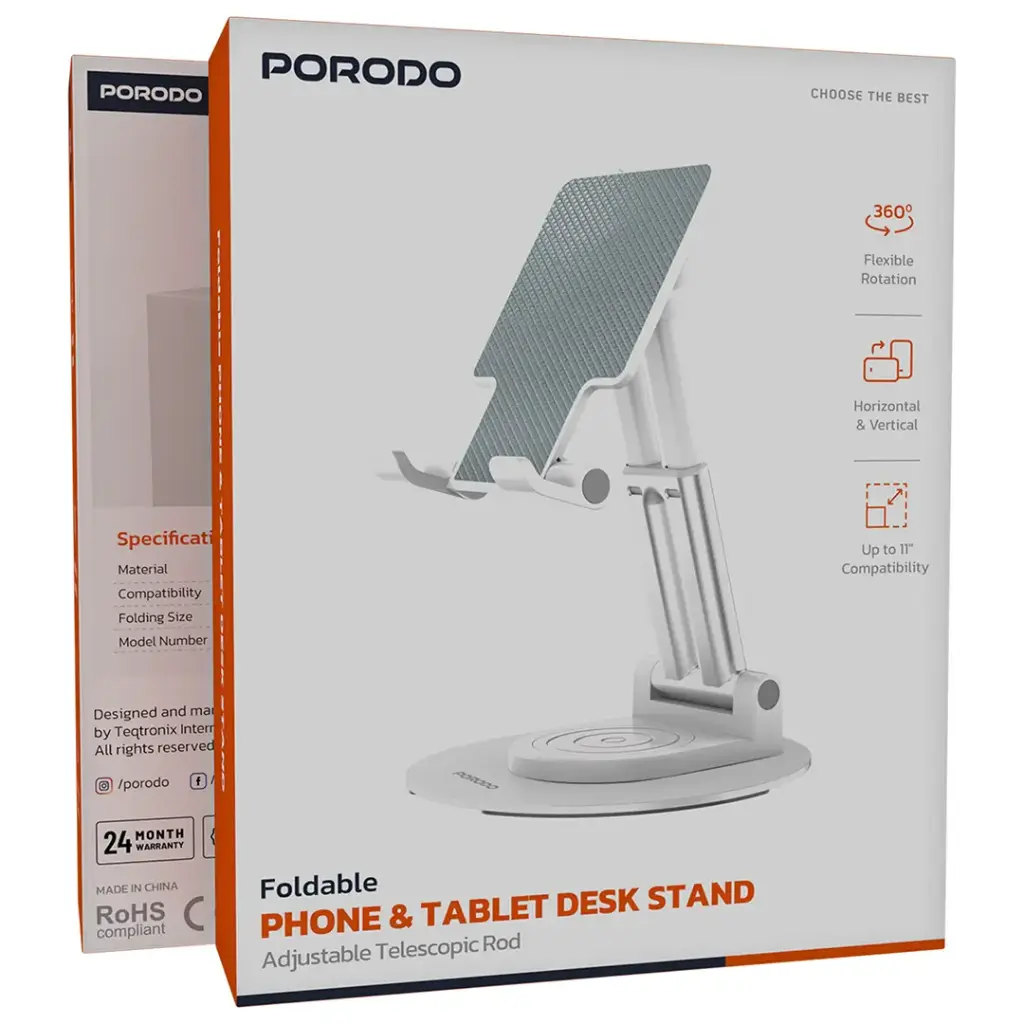 Porodo Foldable Phone & Tablet Desk Stand with Adjustable Telescopic Rod – White