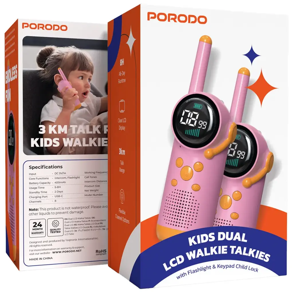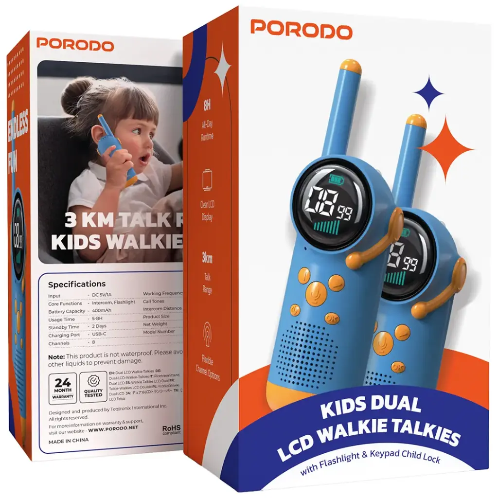 Porodo Kids Dual LCD Walkie Talkies with Flashlight & Keypad Child Lock