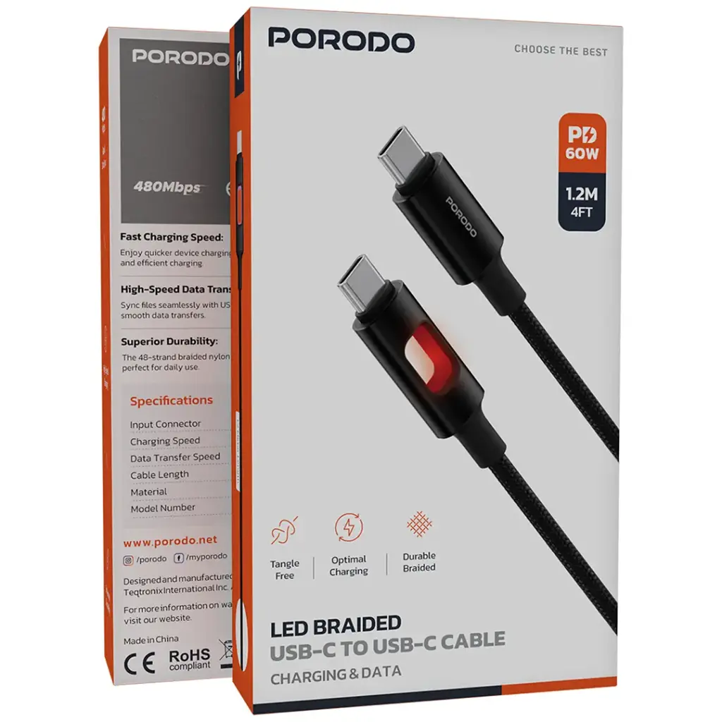 Porodo LED Braided USB-C to USB-C Charging & Data Cable – Black
