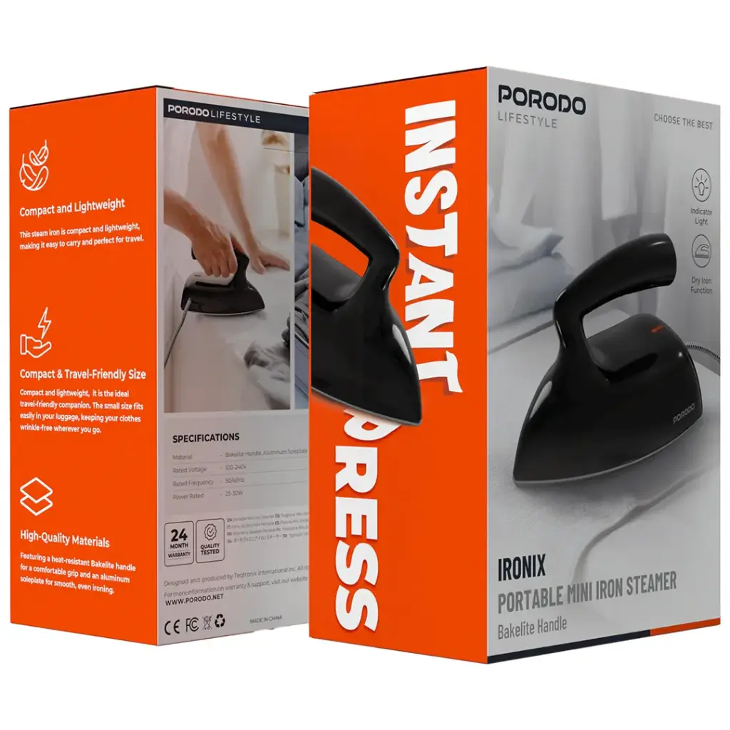 Porodo Lifestyle Ironix Portable Mini Iron Steamer with Bakelite Handle – Black