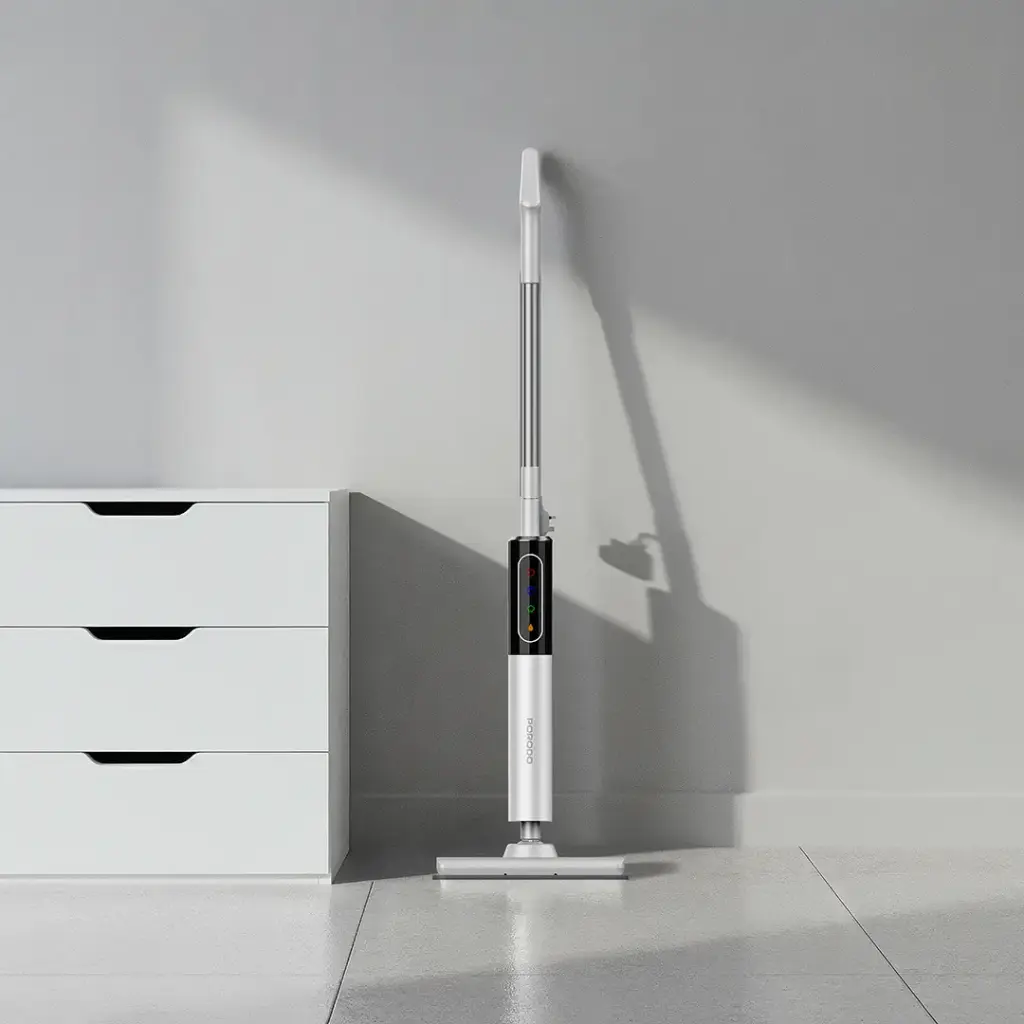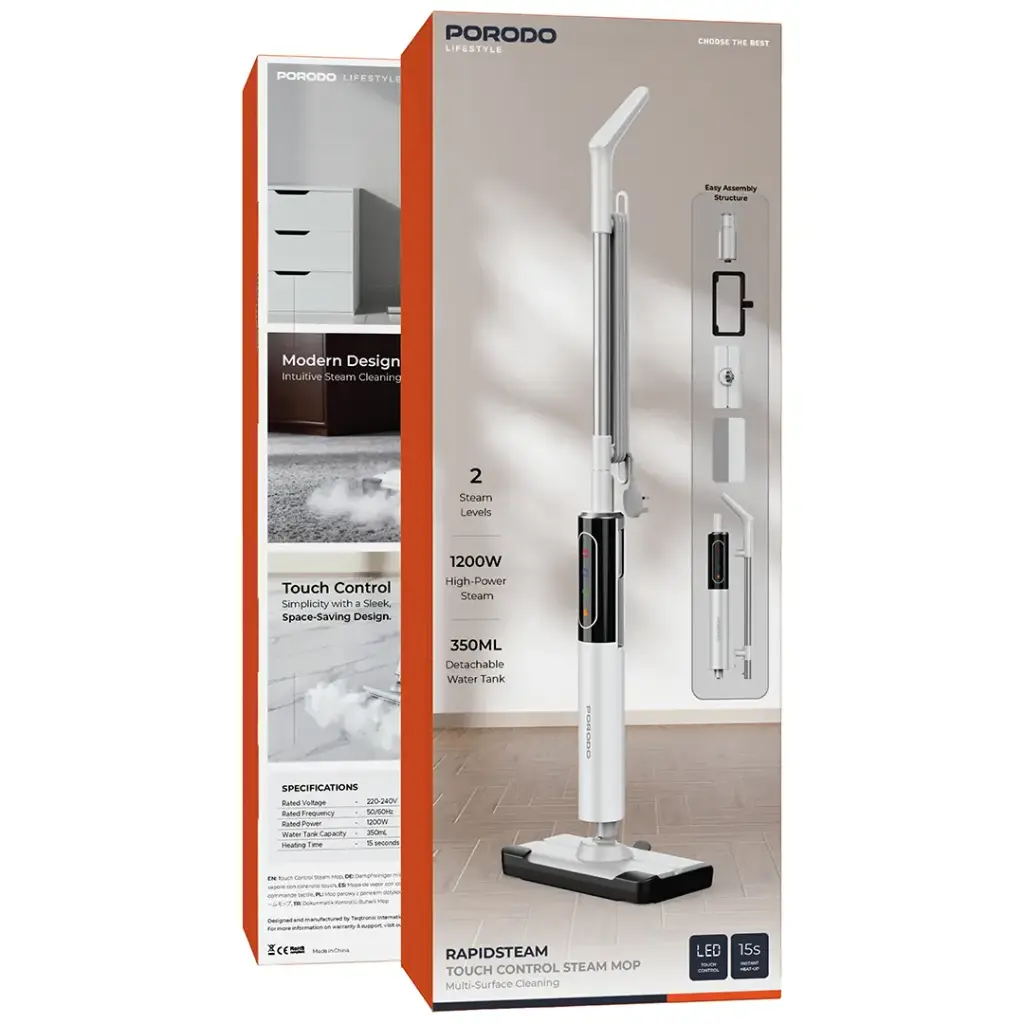 The Porodo Lifestyle RapidSteam Touch Control Steam Mop – White provides an effective steam cleaning solution that delivers high-powered steam cleaning for residential use. The device delivers instant heating capabilities, which enable users to start cleaning their home surfaces within 15 seconds of activation. The system uses 1200W of steam power to remove dirt and grime while users can continue working because the system includes a 350mL detachable water tank. The mop provides two steam levels, which enable users to clean different surfaces that require either light dusting or deep sanitizing. The user can operate the system with touch control, while the system provides complete cleaning coverage, which prevents any area from being missed. The product enables fast installation through its simple assembly design, while its flame-retardant ABS material guarantees both product strength and user protection. The device includes a breathing light indicator that shows the user when it is ready for operation. The mop provides users with a quick and effective cleaning solution, which enables them to keep their home environment completely clean.
