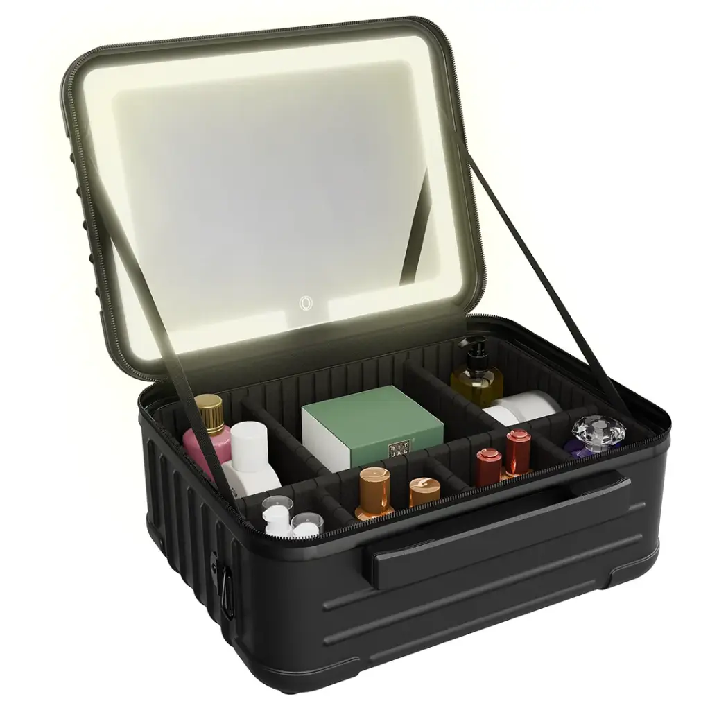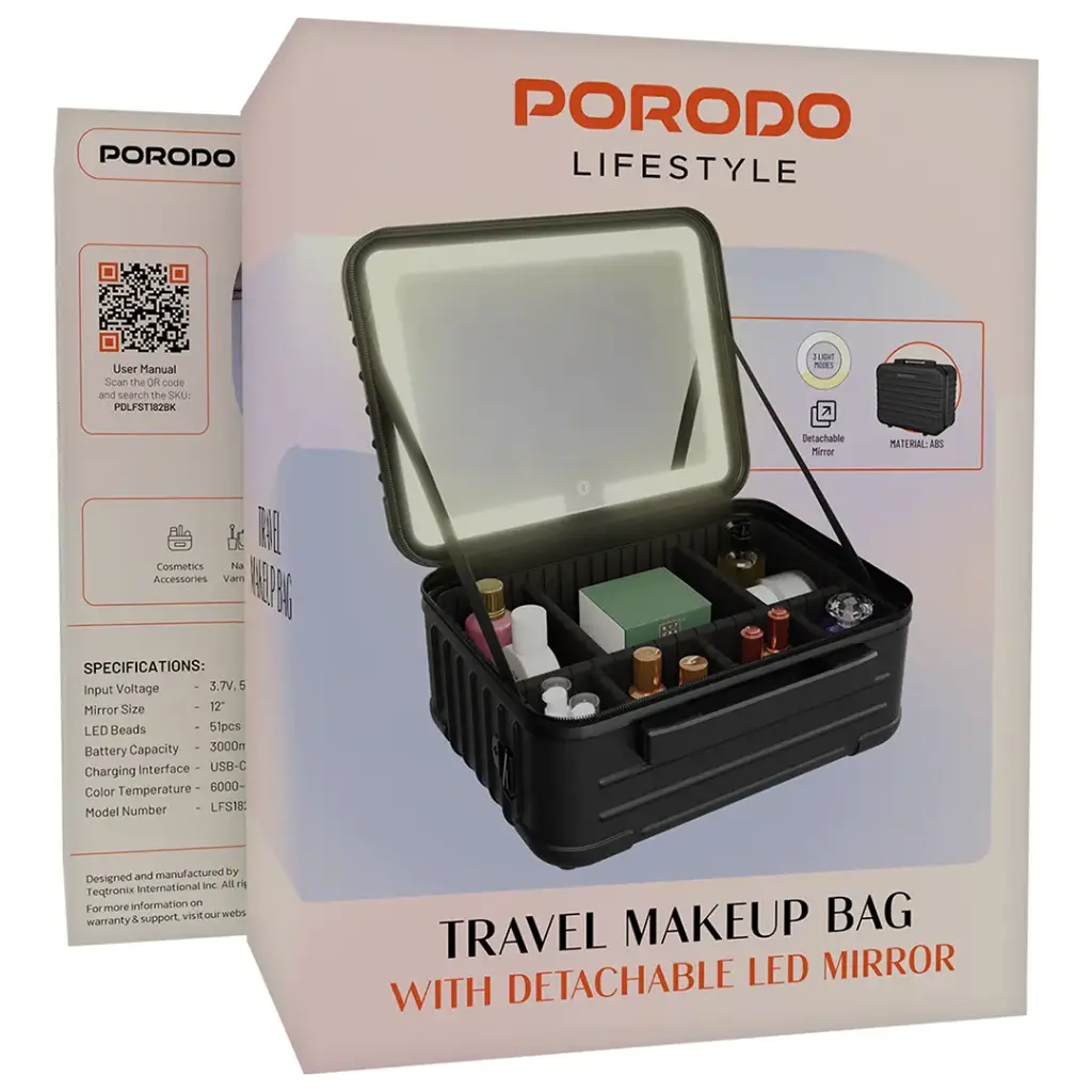Porodo Lifestyle Travel Makeup Bag with Detachable LED Mirror – Black