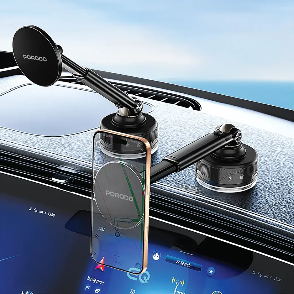 The Porodo MagExtend MagSafe Phone Holder is a very stable and practical solution for your smartphone. The combination of grip from its adhesive base and the strong magnetic hold guarantees that the MagSafe-enabled devices will stay fixed in position whether you are using the holder in the car, at the desk, or in any other location. The holder comes with a fully extended arm that gives a length of 185mm and makes it easier to position your phone for viewing and operation. Additionally, you can easily change from horizontal to vertical modes which is perfect for watching movies or scrolling through apps. The holder is adjustable in a wide range of viewing angles allowing you to choose the most comfortable position for your phone. The one-handed operation feature makes it easy to change the phone’s position with very little effort while the high-quality materials (ABS, PC, Zinc-Alloy, TPU, Silicone) used in its production ensure durability and long life. The MagSafe Phone Holder will surely be the best car companion for you if you are always in the car or on the road.