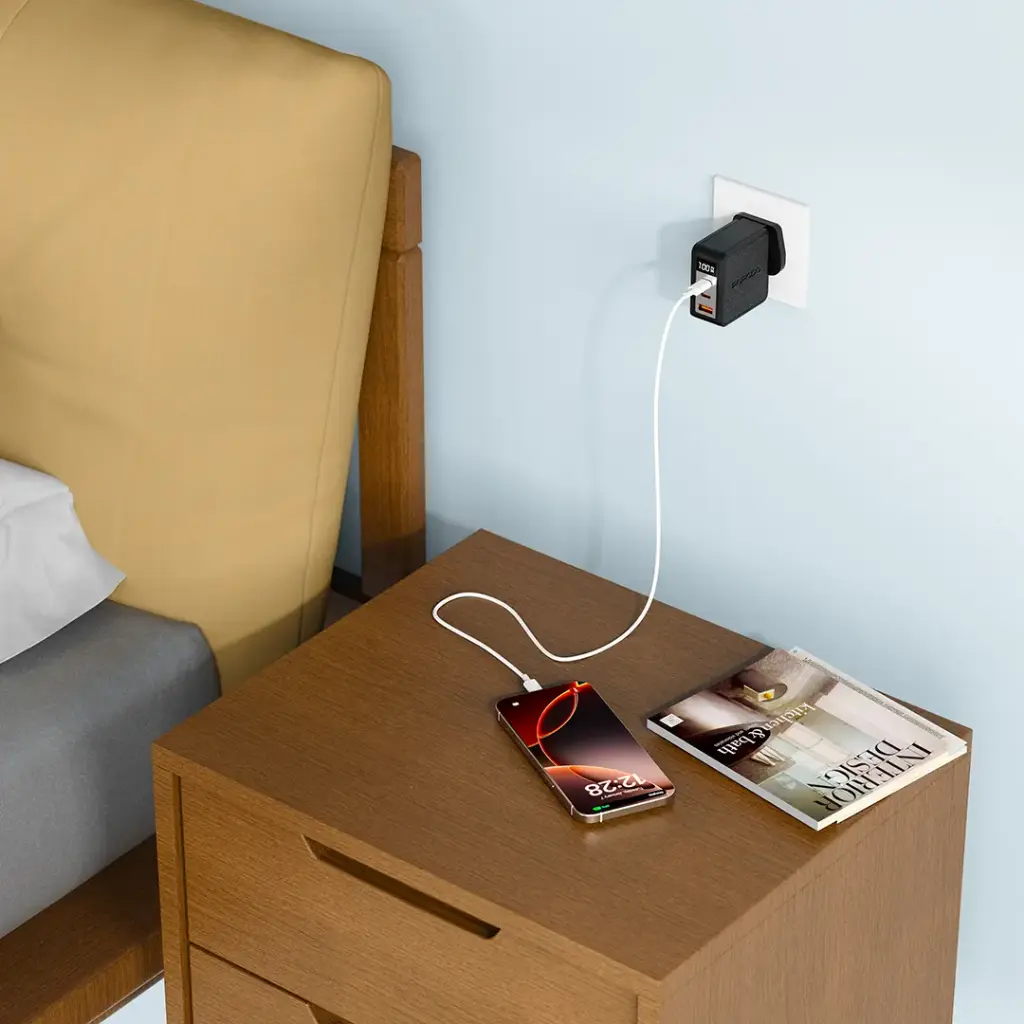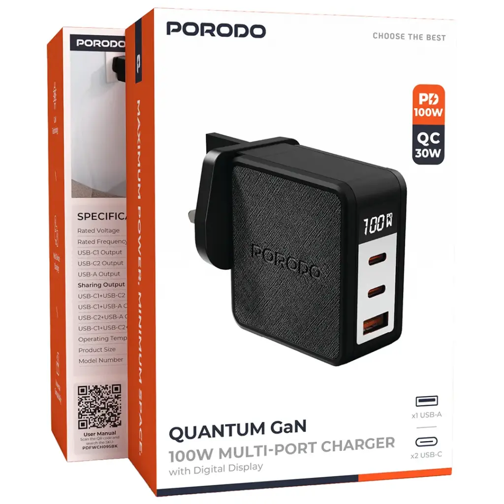 The Porodo Quantum GaN 100W Multi-Port Charger with Digital Display – Black delivers high power and efficiency through its advanced GaN technology. This charger enables users to charge multiple devices at the same time by delivering100W power through two USB-C ports and one USB-A port. The device enables faster charging through its Quick Charge (QC) support while working with numerous different devices. The digital display shows the real-time charging status, making it easy to keep track of your devices’ power. The product has a compact design, which makes it perfect for use during travel and in home and office environments. The Porodo Quantum GaN 100W Multi-Port Charger delivers fast and dependable power, which charges phones, tablets, and laptops through its single modern design.