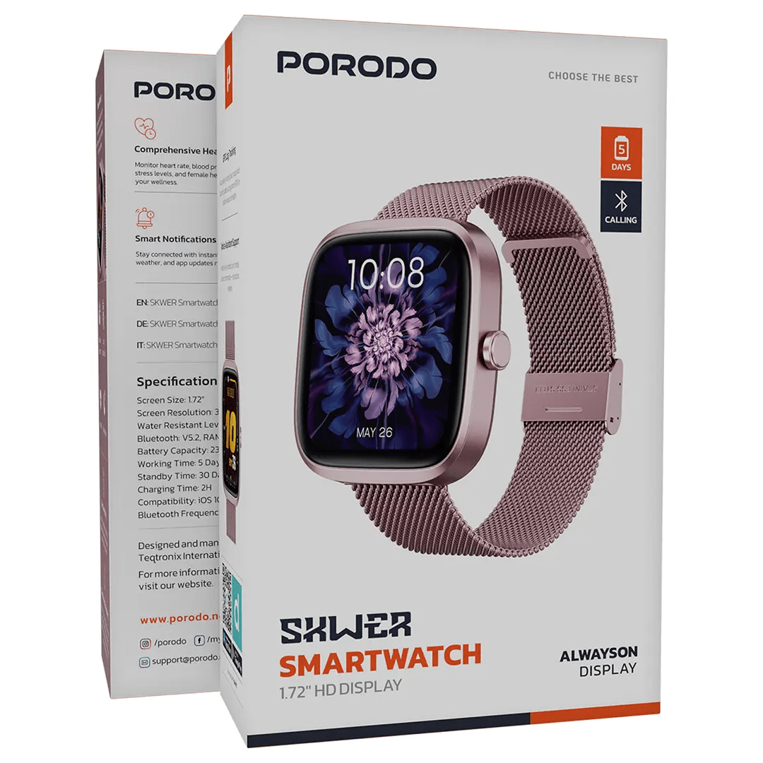 The 1.72″ HD Porodo Skwer Smart Watch with a resolution of 360×360 is a feature-packed yet elegant timepiece with a sleek and lightweight design. Its 230mAh battery provides 5 days of active use and 30 days on standby, and only requires a 2-hour fast charging time. Bluetooth V5.2 connectivity gives it the ability to pair with any smart device with an iOS of 10+ or an Android version of 10.0+. The comprehensive health-tracking features monitor heart rate, sleep, and stress while providing feedback on improving health. It’s also equipped with GPS log tracking, smart notification support, camera shutter, voice assistant support, and weather forecasting. It is rated IP68 water-resistant, fully ruggedized, and suitable for everyday use. Now, stay connected, keep fit, and track your activities with the Porodo Skwer Smart Watch, for those who appreciate both technology and splendor.