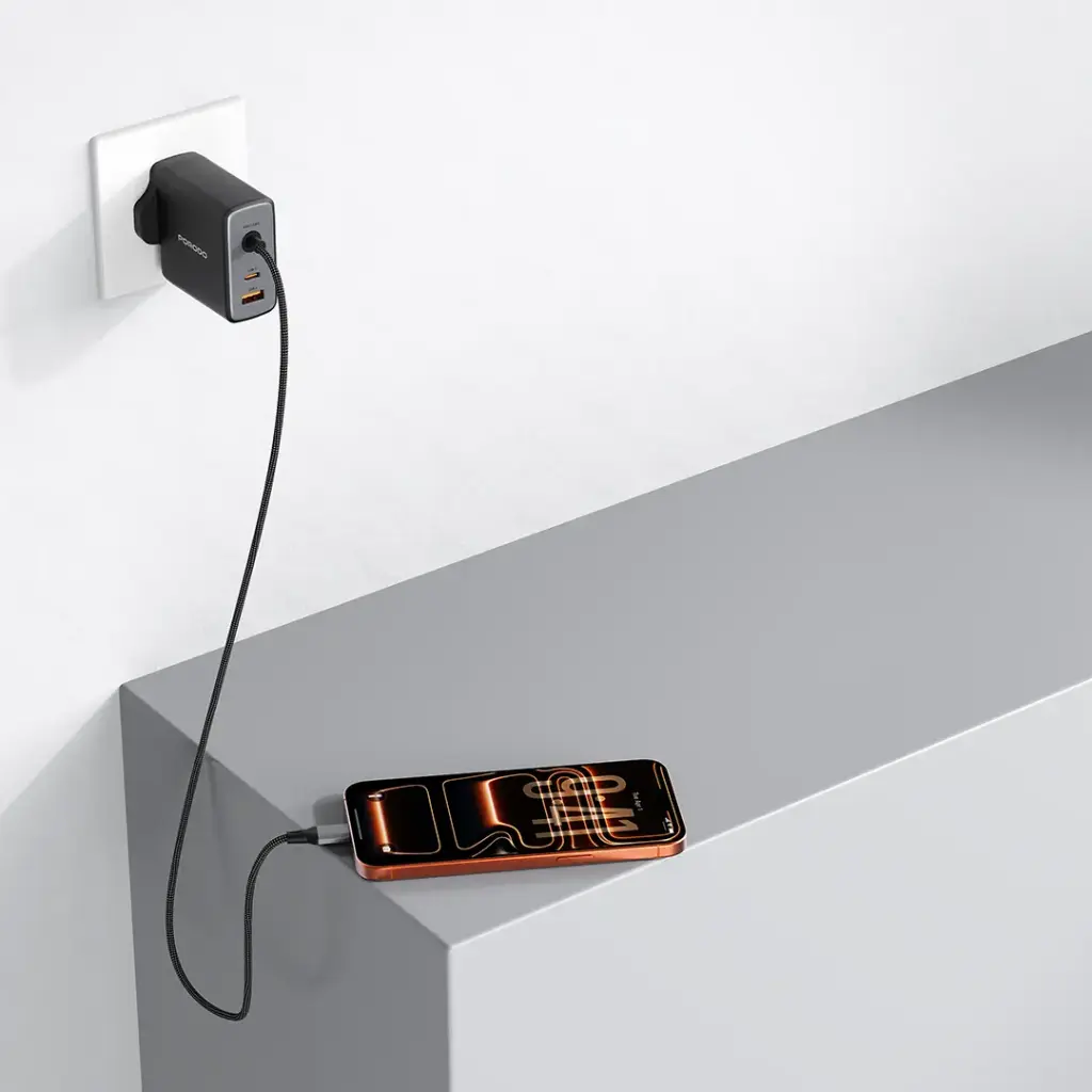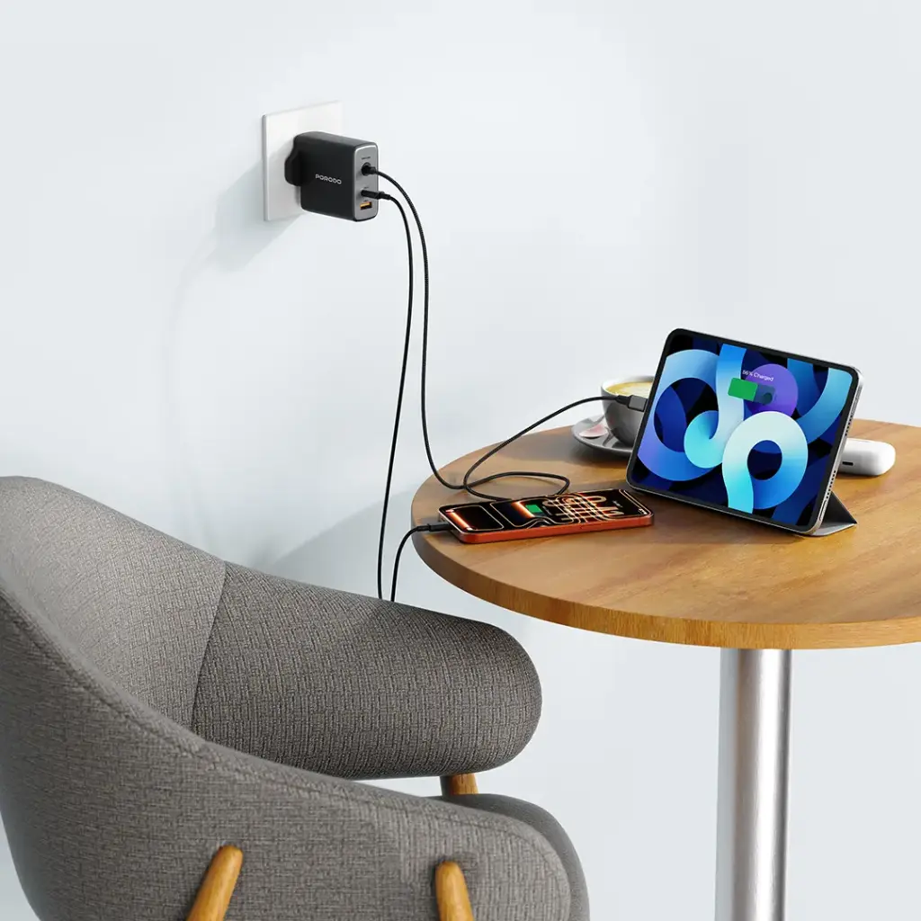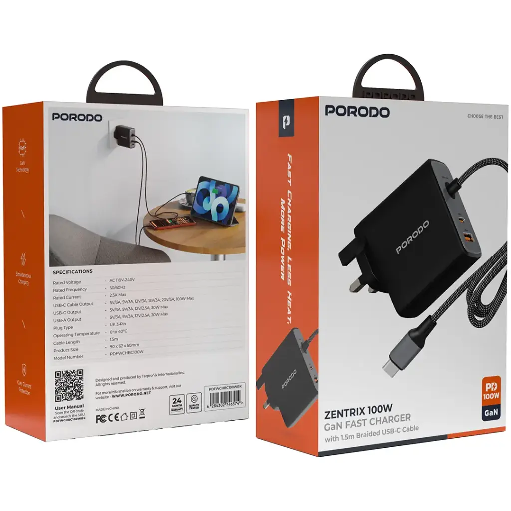 The Porodo Zentrix 100W GaN Fast Charger with 1.5m Braided USB-C Cable – Black uses GaN technology to deliver high charging power. This charger enables users to charge multiple devices at once through its ability to provide fast and efficient power delivery, which makes it suitable for charging phones, tablets,, and laptops. The device offers safe charging through its overcurrent protection feature while its fast charging function enables users to power their devices within short timeframes and with low heat output. The 1.5m braided USB-C cable provides a durable and reliable connection that maintains its strength throughout various usage scenarios due to its compact design. The Porodo Zentrix 100W GaN Fast Charger functions as an ideal charging solution because it enables you to access essential power while maintaining high charging speed and safe operation at home or during your travels.