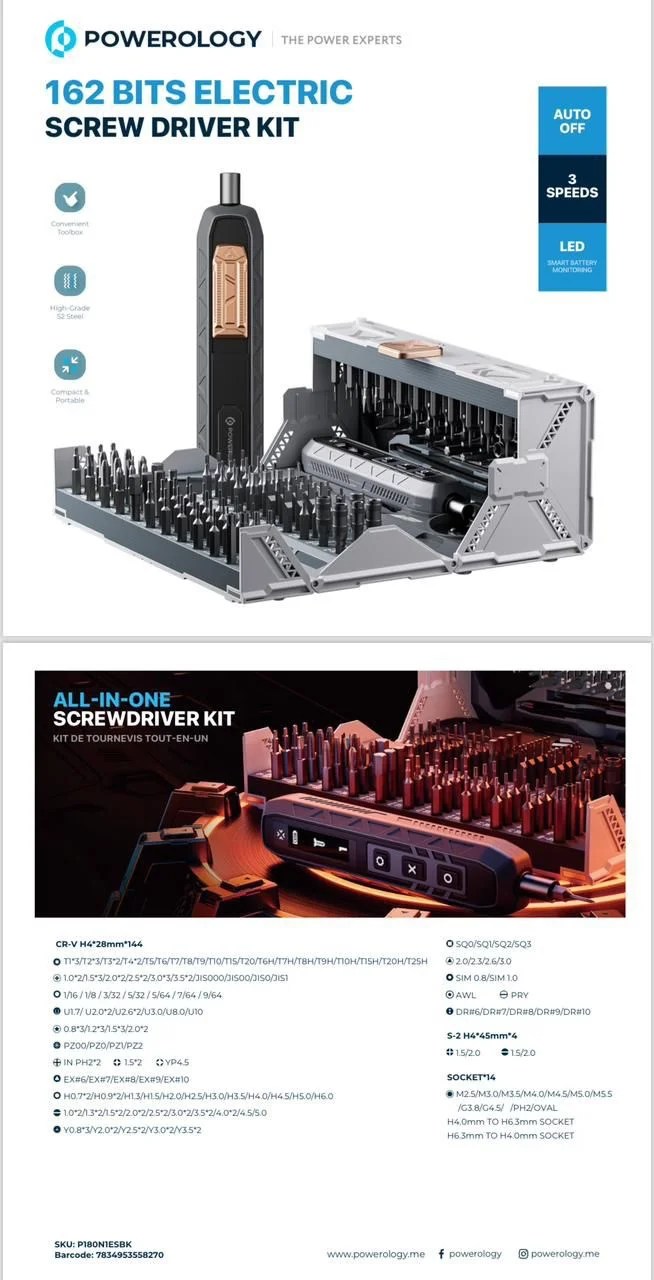 The Powerology 162 Bits Electric Screwdriver Kit is the most complete electric screwdriver set. This screwdriver kit has 162 heads, which are all made from S2 steel. The screwdriver has 3-speed modes, and because of its size, it is very compact and portable. The Powerology 162 Bits Electric Screwdriver Kit is the best toolkit, whether you are a professional or even an amateur.