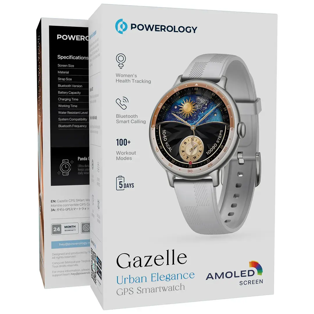 The Powerology Gazelle Urban Elegance GPS Smartwatch is the epitome of style and functionality, offering a sleek 1.19-inch AMOLED display and a zinc alloy frame. It connects with your Android (8.0+) or iOS (12+) devices via Bluetooth V5.4. The 300mAh battery gives it working time for up to five days on a full charge, with a charging time of 2.5 hours. The watch has an IP68 rating for ingress protection, so it is fit for every condition. In-built GPS enables instant location tracking. Offering dynamic watch faces, sleep, and stress monitoring as well as women’s health tracking, the smartwatch could not be more feature-rich. Bluetooth smart calling allows for hands-free conversations as it supports over 100 workout modes that invite you to keep moving. A brightness rating of 1000 nits ensures bright visibility under sunlight and, conversely, offers better battery efficiency with sensors that dim the screen automatically when indoors. The Gazelle Urban Elegance Smartwatch combines technology with fashion to create its aura.