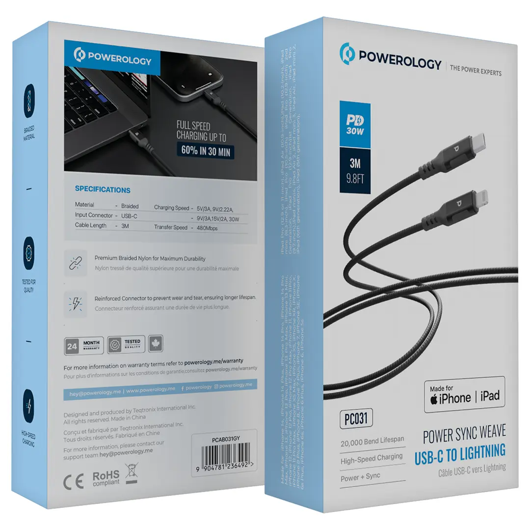 Powerology Power Sync Weave PD 30W USB-C to Lightning 3m Cable – Gray