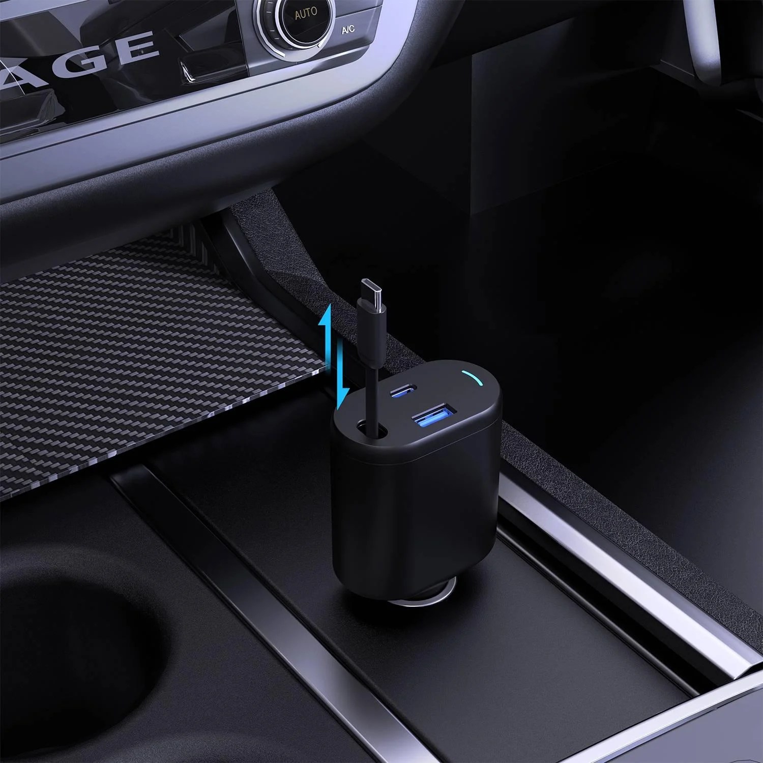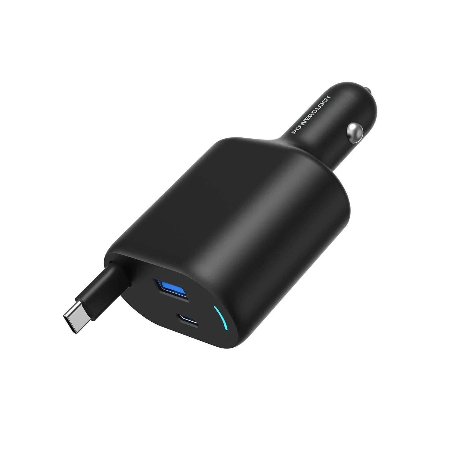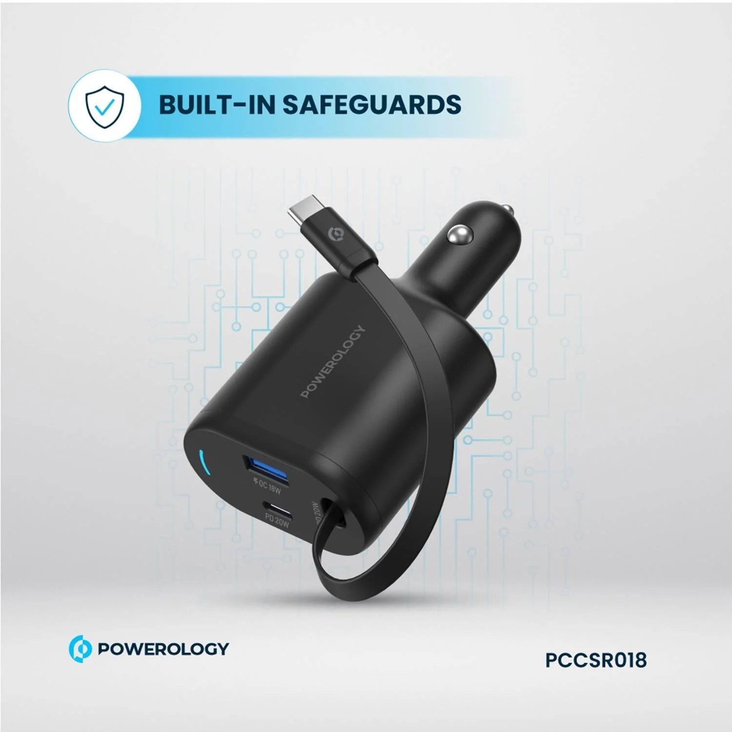 The Powerology Type-C Retractable Car Charger is a flexible and efficient charging solution for your car. This charger has a 12V-24V DC input and 70W output. Its fast chargers can charge multiple devices at once. The USB-C port delivers up to 20W and the USB-A port supports 30W. Both are compatible with many smartphones, tablets, and other devices. The integrated 1m Type-C cable provides an additional 20W of power, adding convenience for passengers. The charger has built-in safeguards against overcharging and Current. It works safely in environments with -20°C to 50°C. Its patented design is compact and durable, making it ideal for daily commutes and road trips. The Powerology Type-C Retractable Car Charger combines efficiency, safety, and convenience in one stylish package.