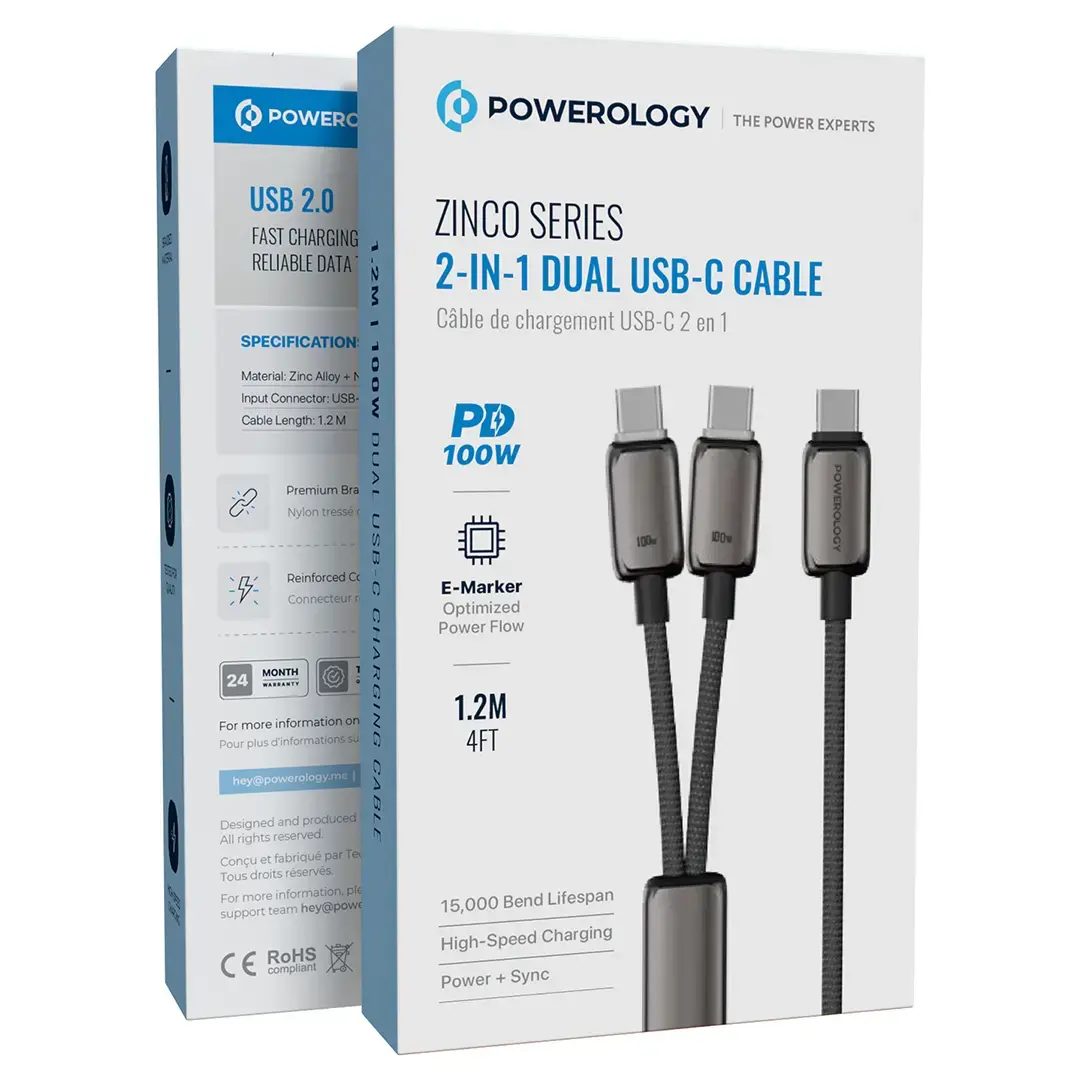 Powerology Zinco Series 2-In-1 Dual USB-C Cable – Dark Gray