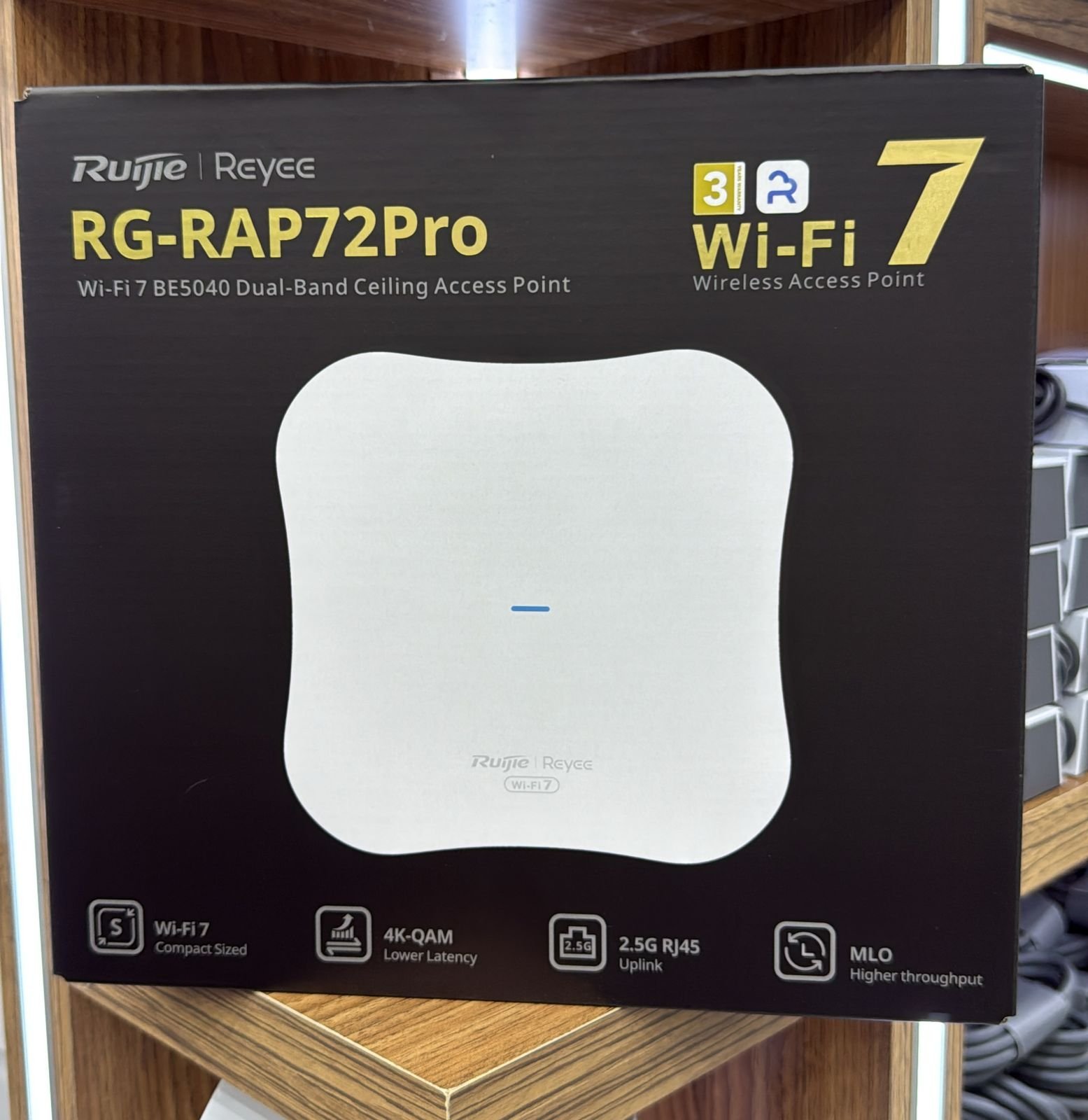 The Ruijie Reyee RG‑RAP72Pro delivers blazing-fast connectivity with next-generation Wi‑Fi 7 (BE5040) technology, perfect for modern homes, offices, hotels, and high-density environments. Featuring a compact ceiling‑mount design, it supports Multi-Link Operation (MLO) and 4K‑QAM for low-latency, ultra‑stable performance. Seamlessly integrated with Ruijie Cloud management, this AP ensures hassle-free deployment and superior network optimization.